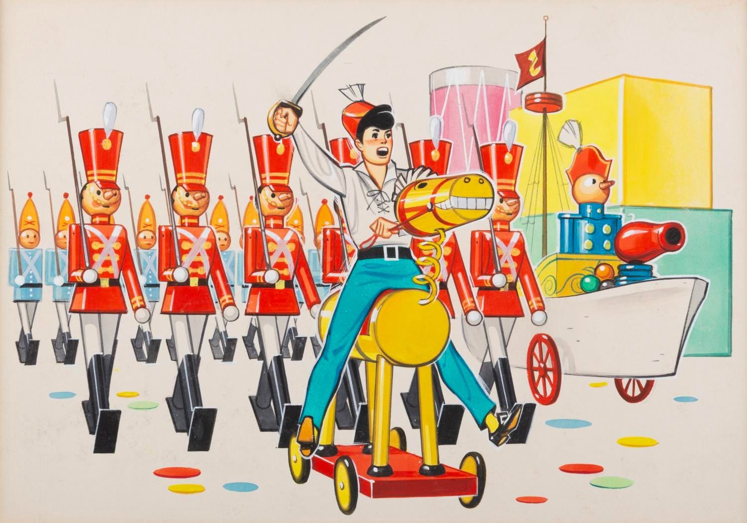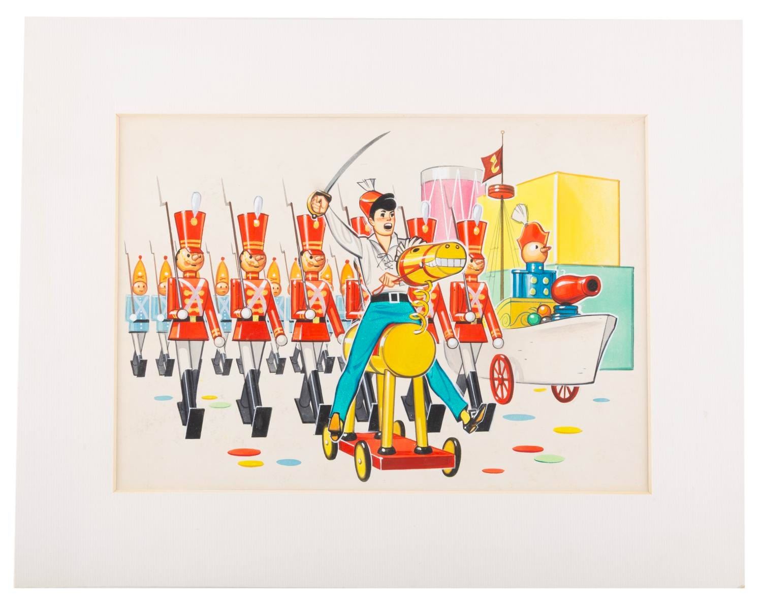 (Disney, 1960s) An original painting for a "Babes in Toyland" book illustration, depicting Tommy Sands as Tom Piper leading the March of the Wooden Soldiers. The painting is accomplished in gouache on artist’s board. With an image size of 7.5" x 11", the art is in very good condition with very light wear from age.