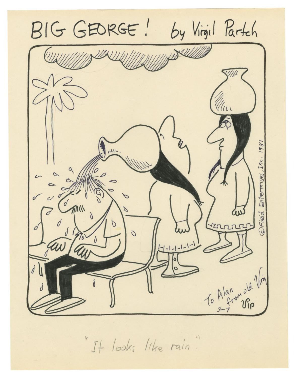 (Partch, 1981) An original "Big George!" comic panel by cartoonist Virgil Partch, known for his magazine cartoons of the 40s and 50s, and for creating the newspaper comic strips "Big George" and "The Captain's Gig." Accomplished in ink on Partch's comic template stationery, the drawing is titled "It Looks Like Rain" and features Big George. This original artwork is personalized "To Alan from Old Virg." Measuring 11" x 8.5" the panel is in very good condition.