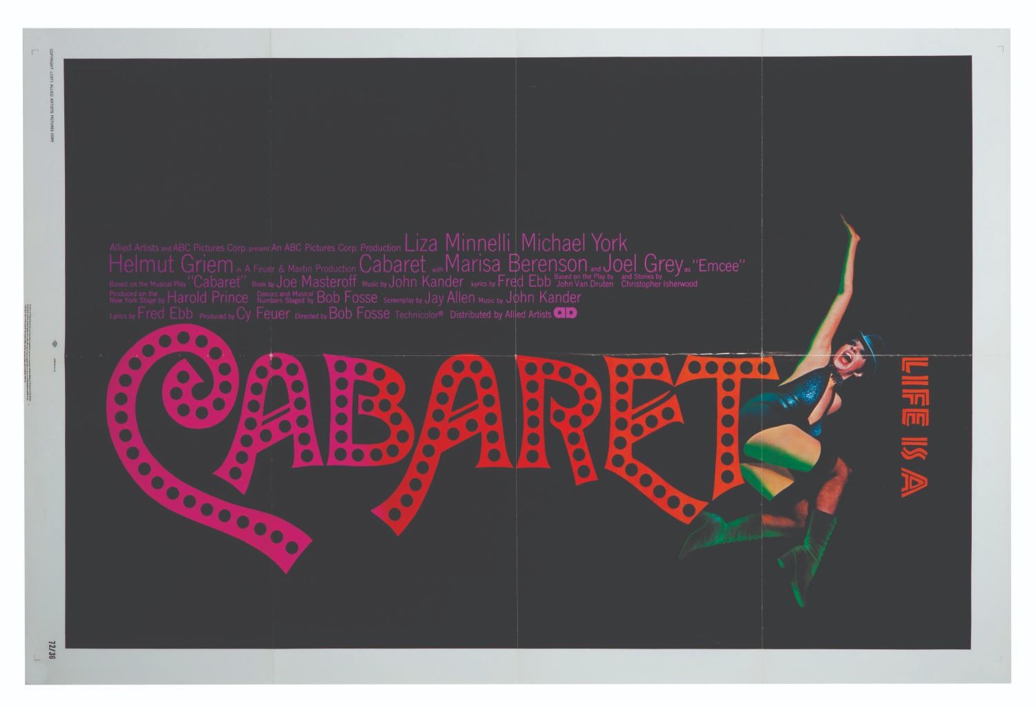 (Allied Artists, 1972) An original one-sheet for the Bob Fosse musical Cabaret. Measuring 27"x41", the poster is in very good condition, showing light crease marks overall and along original fold, slight separation at one center point, light wear to edges, and a faint 6.5" long scuff in the lower left corner.