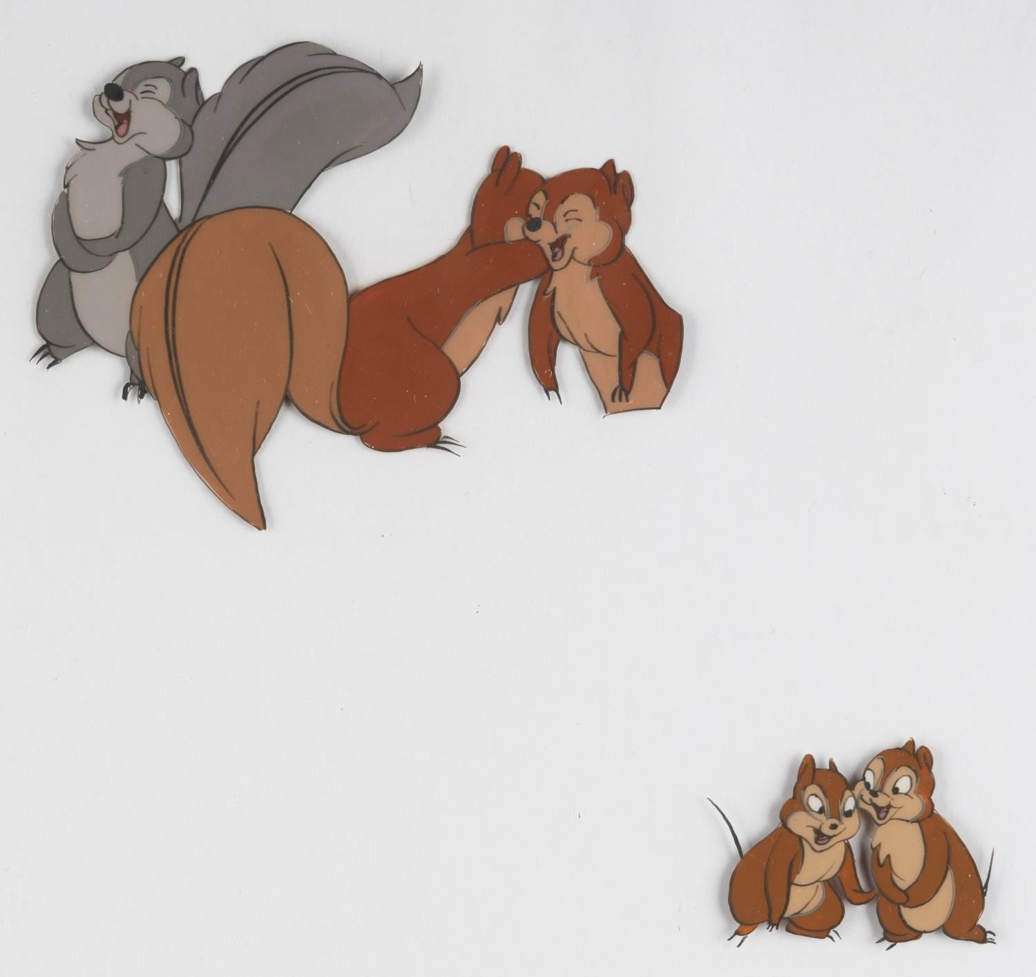 (Disneyland, 1958) An original production cel of animals from the Walt Disney Presents episode "From All of Us to All of You." The Christmas television special aired on December 15, 1958. The three squirrels at the top measure 3"x2" and the two chipmunks below them measure 1"x1" on an untrimmed 10" x 12" cel. The artwork is in very good condition with all paint intact.