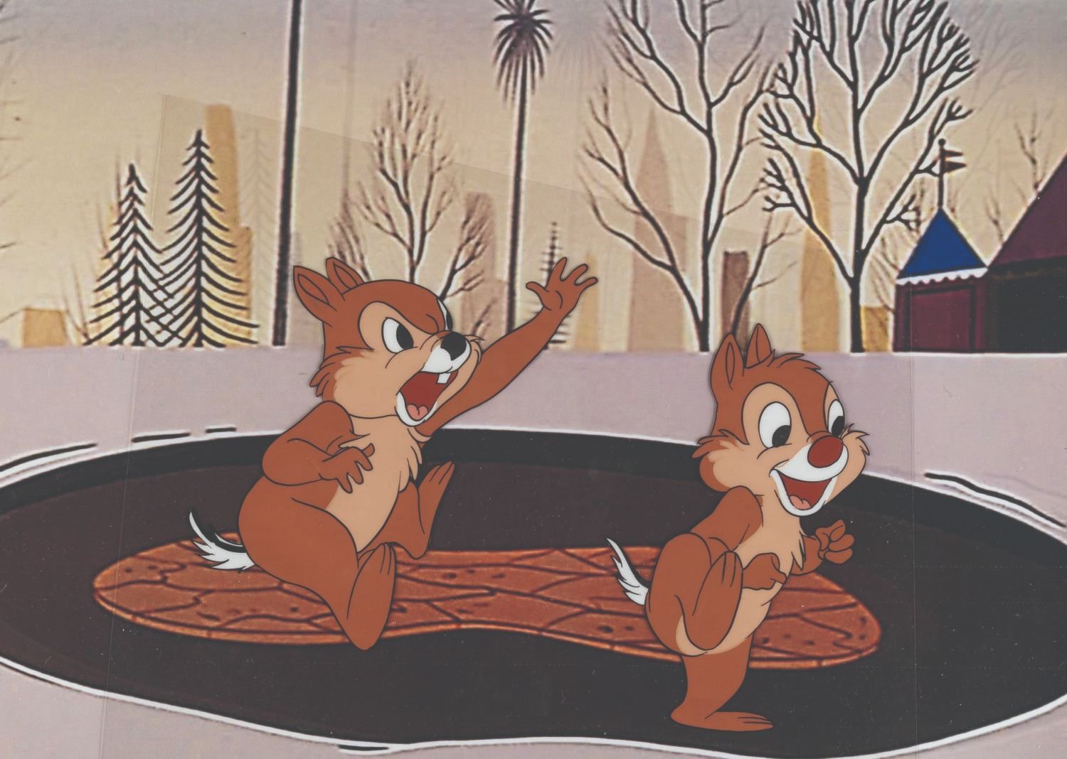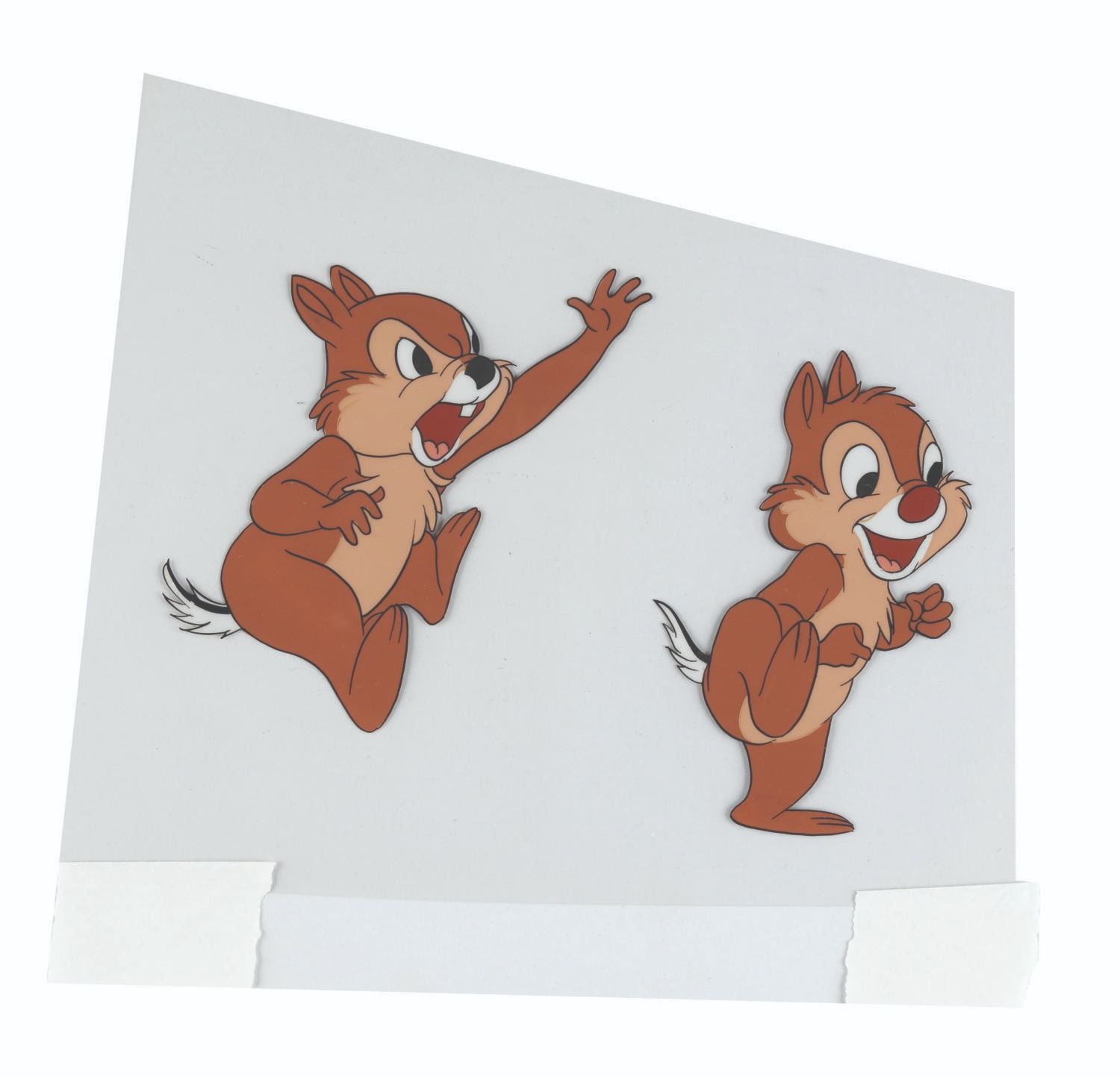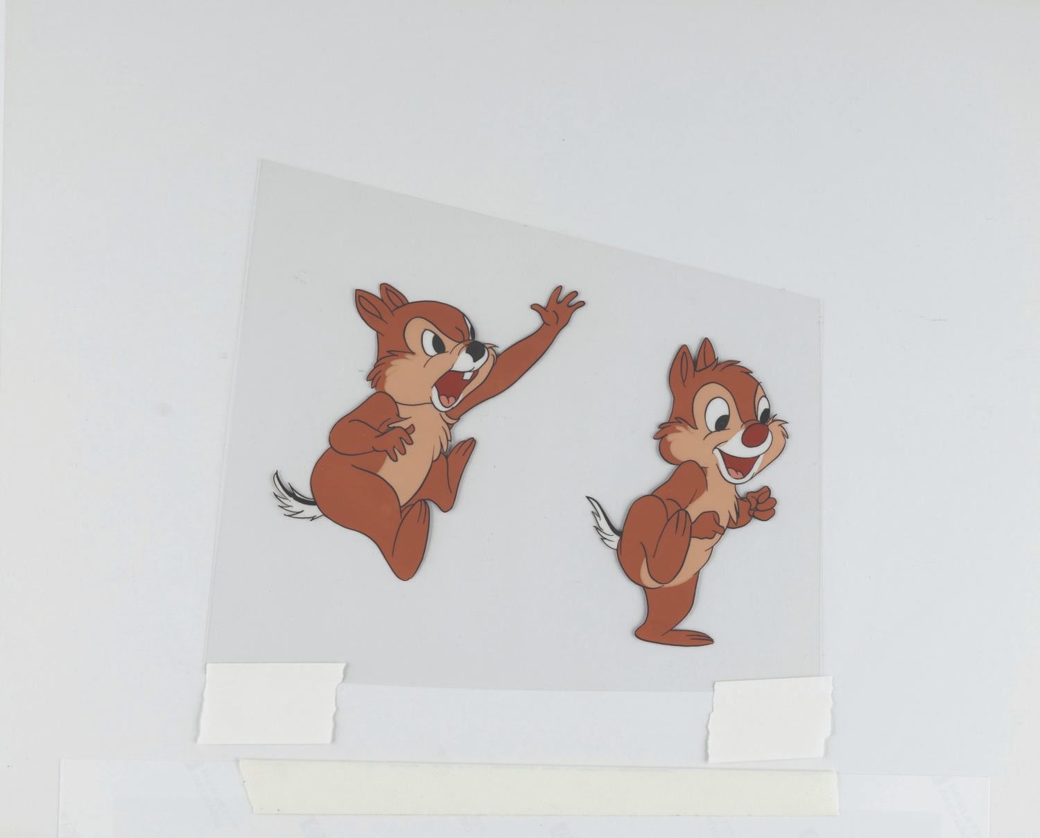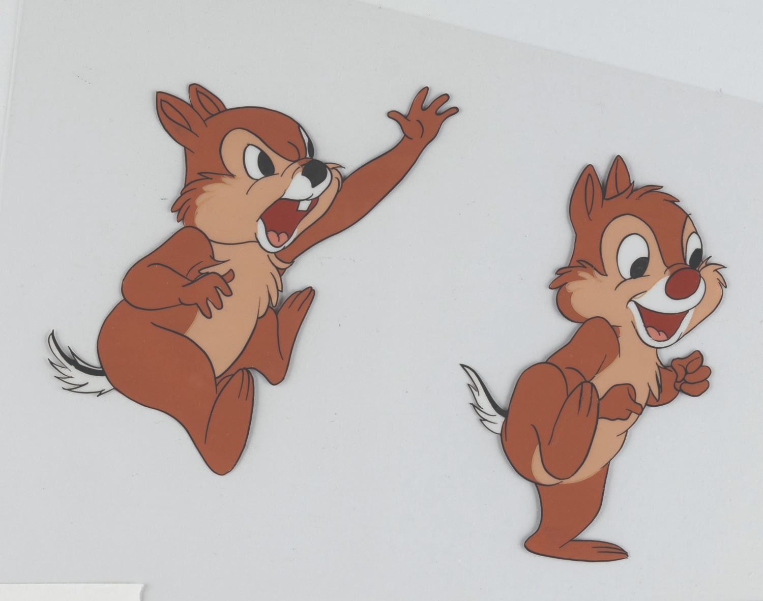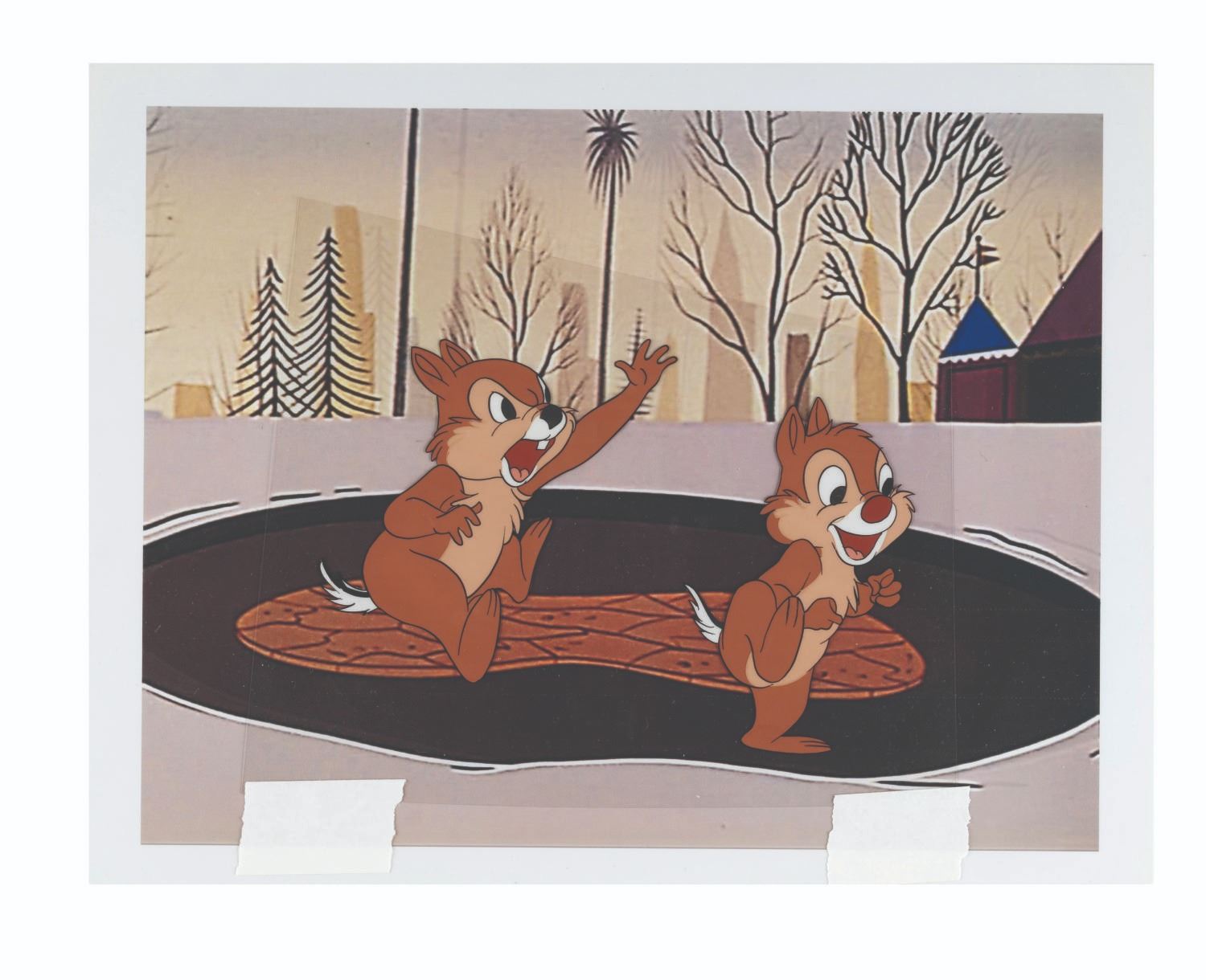 (Disney, 1950s) An original production cel of Chip N’ Dale from a Disney animated cartoon. With an image size of 6” x 4.25” on the trimmed 6” x 7.25” cel, the piece with a color copy background displays in very good condition.