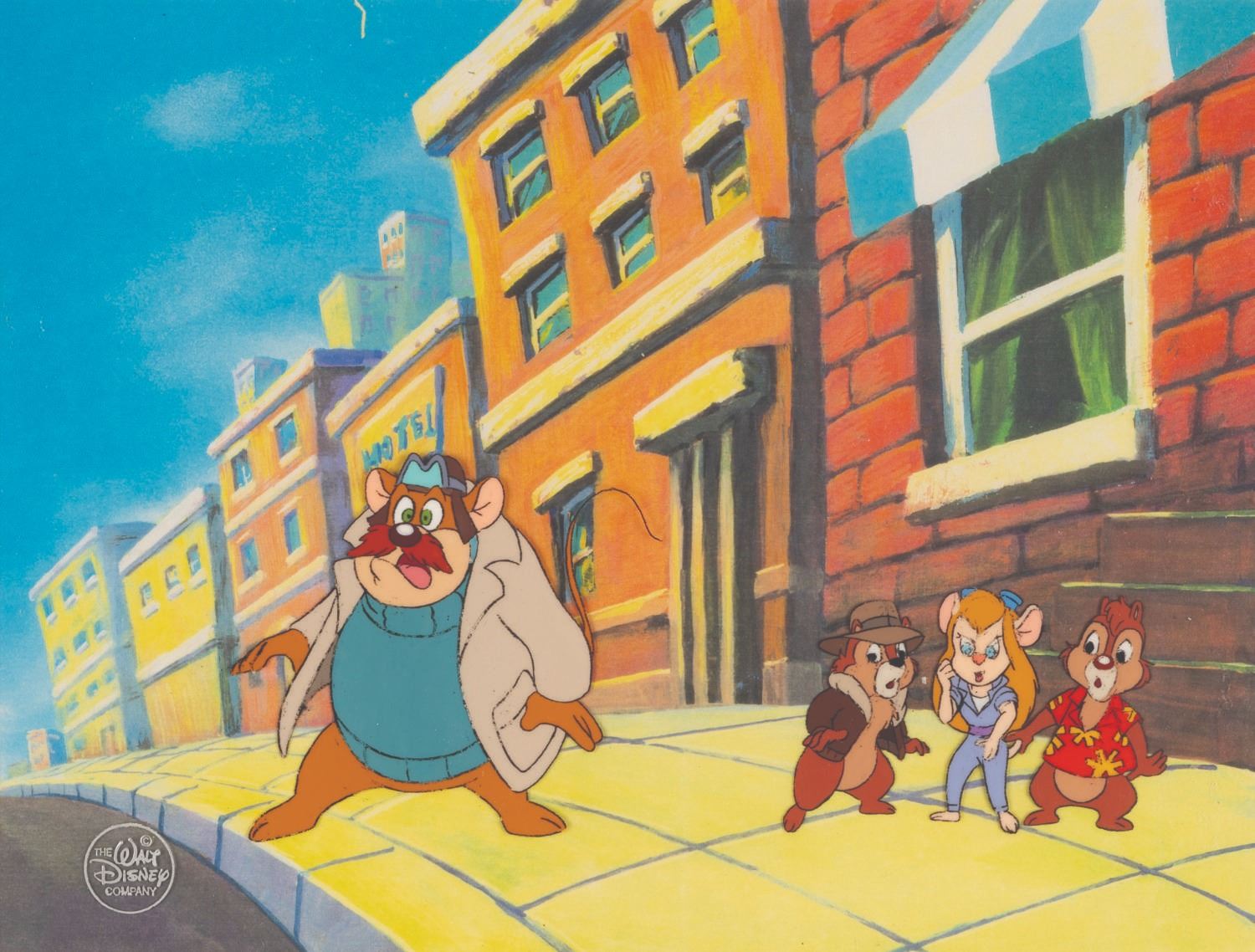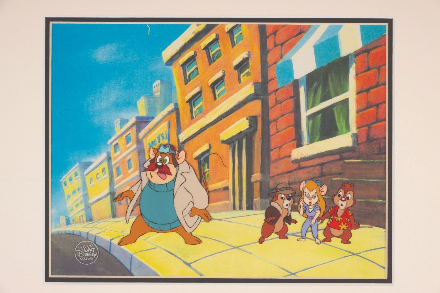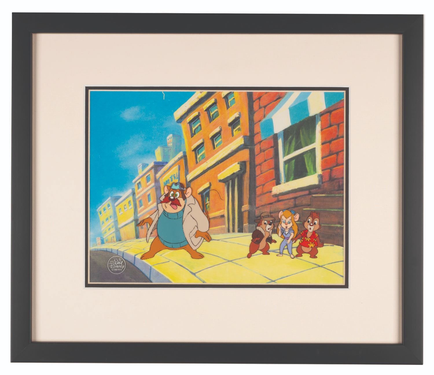 (Disney, 1989-90) An original hand-painted “Chip ‘n Dale Rescue Rangers” production cel featuring the main cast. With a character image size of 3” x 7” in a 7” x 9.25” matte opening of a 12.75” x 15” frame, the cel displays in good condition with line fading and loss. The cel is presented with a color copy reproduction background.