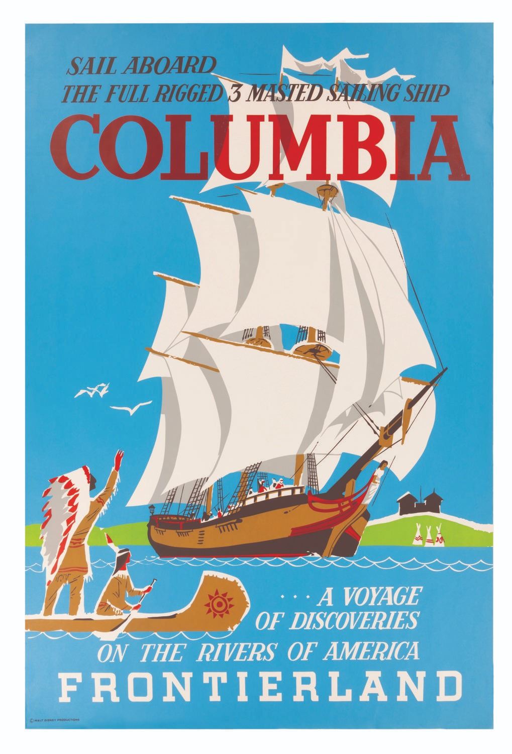 (Disneyland, 1958) A hand-silkscreened poster for the Sailing Ship Columbia attraction. Designed by Bjorn Aronson, this poster captures the feeling of the original Frontierland with stunning imagery. The poster measures 36" x 54" and is in fine condition with bright colors and only very minor edge wear. This is one of the best conditions we have seen for this poster.