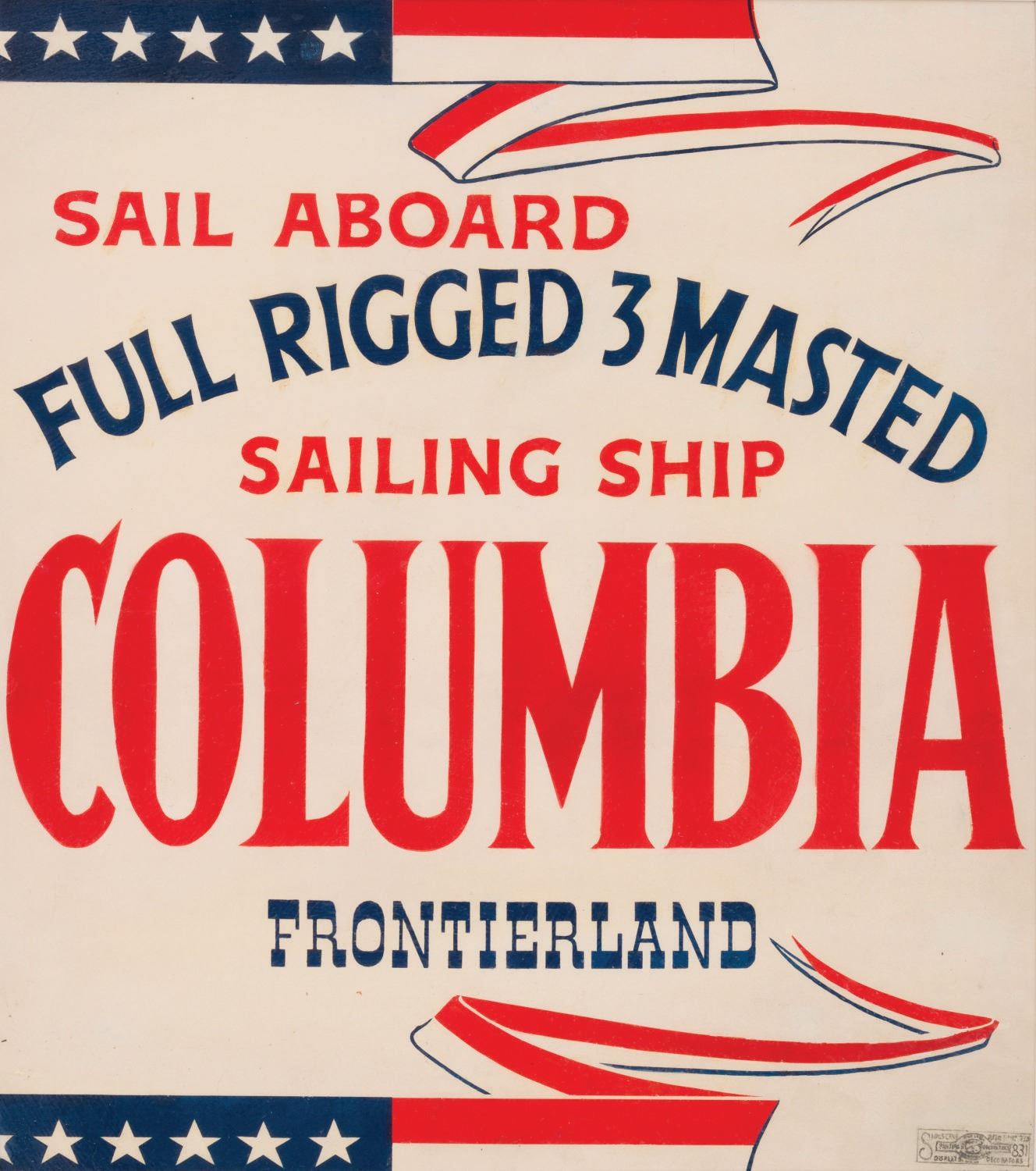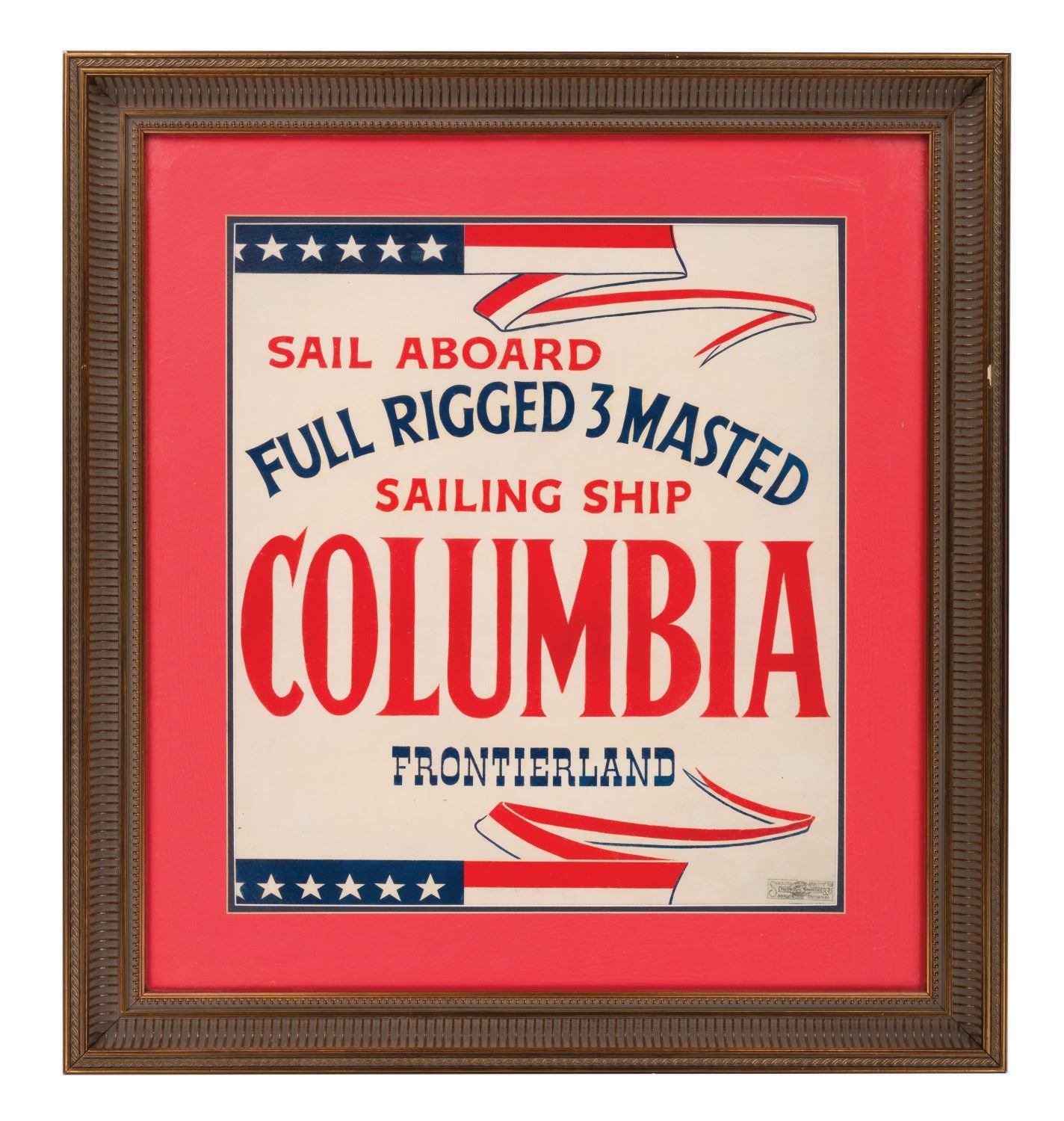 (Disneyland, 1958) An original silk-screened lamppost sign displayed for the opening of The Sailing Ship Columbia Attraction at Disneyland. Signs like this one were displayed in the Park to announce this new attraction of 1958. The piece measures 18"x16". The silk-screened on board sign is in very good condition, with minor yellowing to surface, and small hand-painted area of repair to the ribbon graphic.