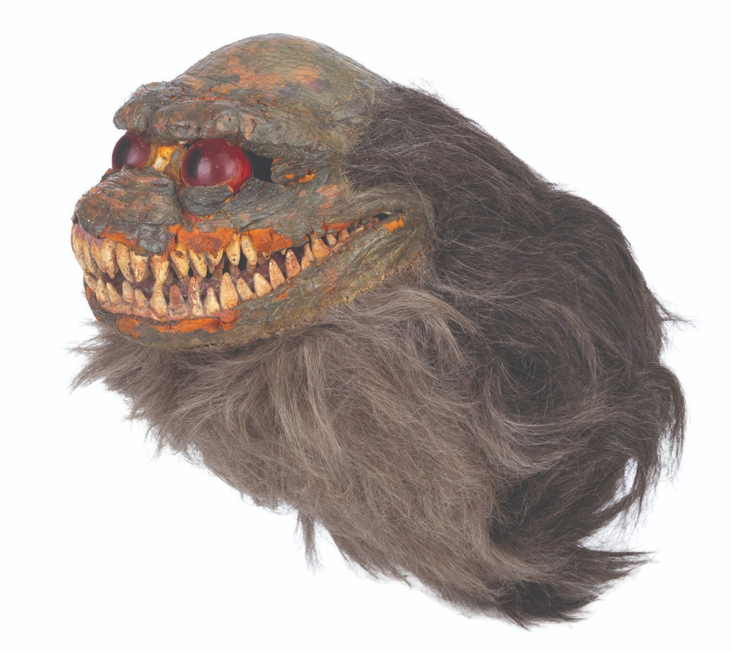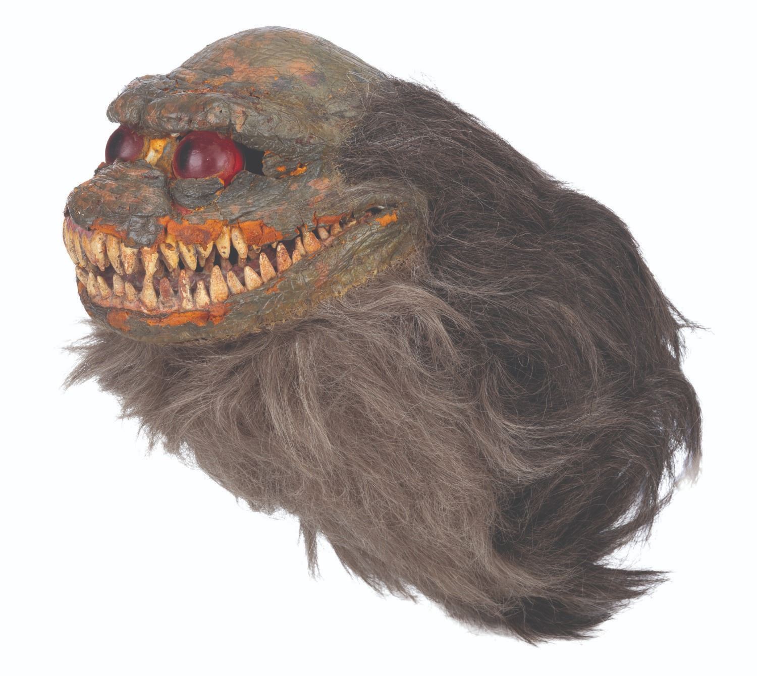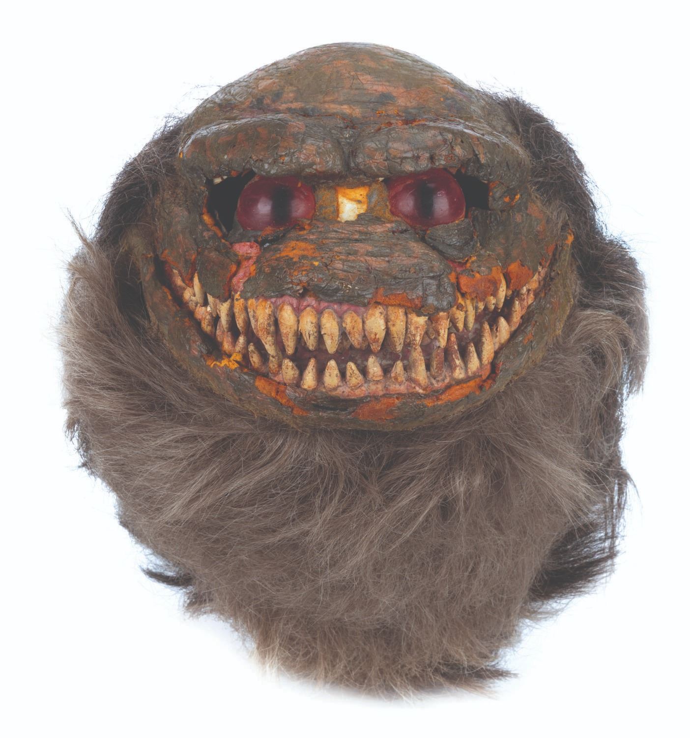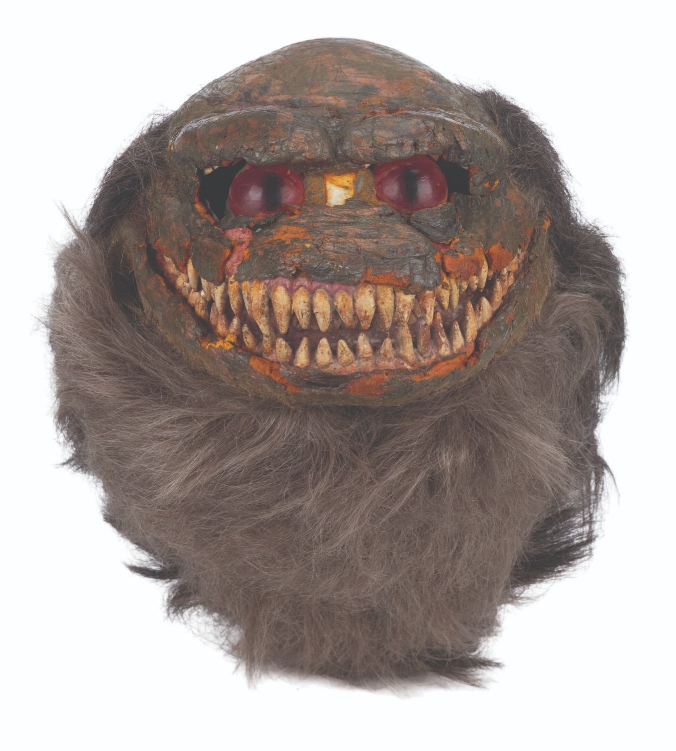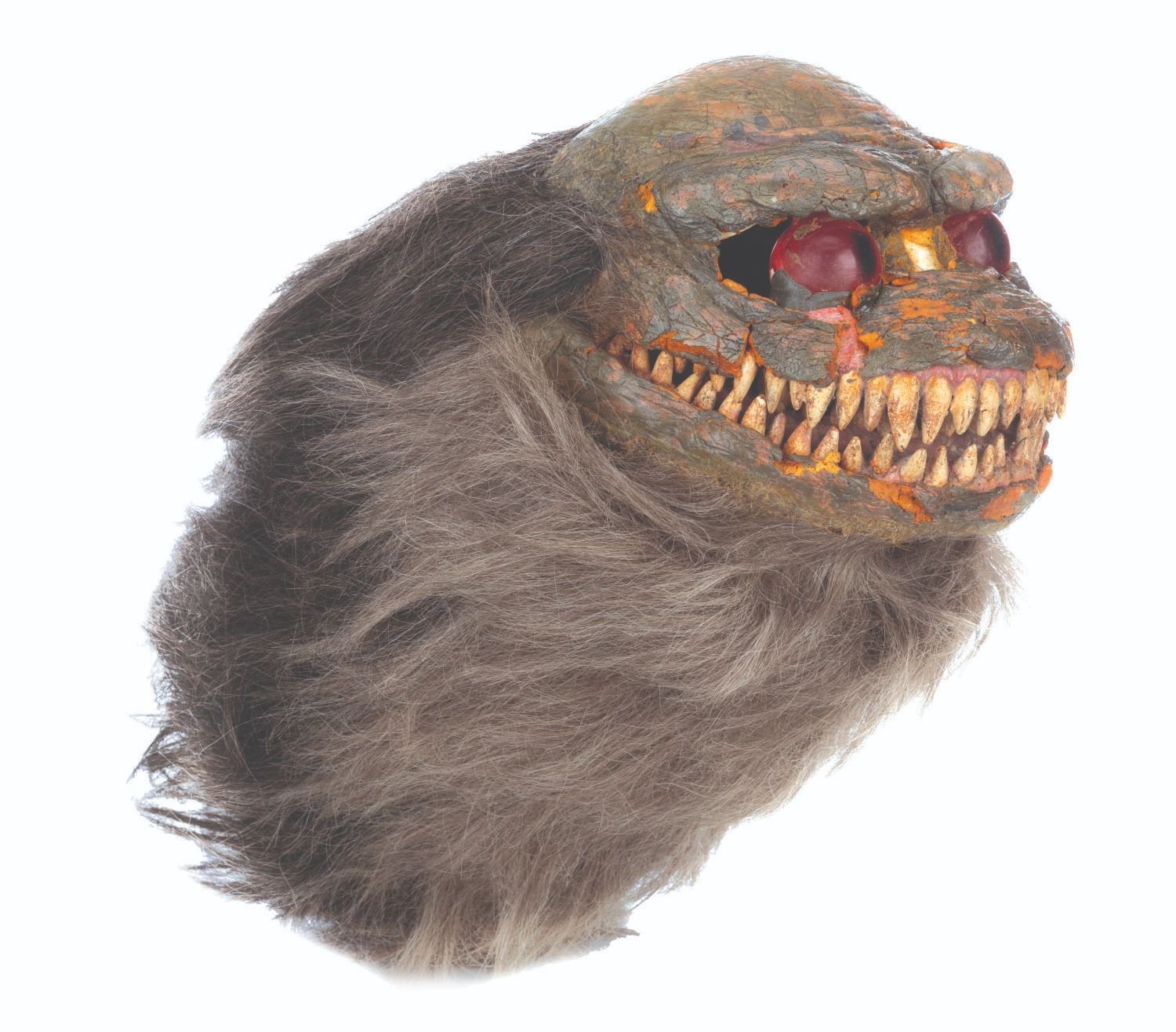 (New Line, 1992) A screen-used Crite puppet from “Critters 4.” This “stunt” puppet of Baldy was used in scenes in which he is lunging directly at the camera. The puppet is constructed from foam latex with coarse faux-hair, acrylic eyes, and a metal tube inside for the puppeteering controls to be inserted. Measuring 10” x 8” x 16” long, the puppet displays in good, production-used condition with deterioration to the foam around the mouth, brow, between the eyes, and total loss to the right and left side of the eyes. The puppet does not include its original arms.