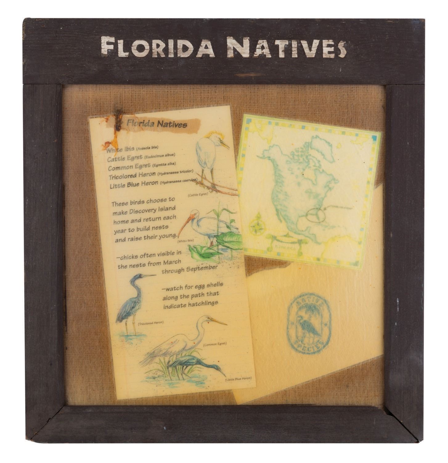 (1978-1999) A one-of-a-kind sign that once stood along the trails of Discovery Island on Bay Lake at Walt Disney World. The one-time zoological preserve sanctuary was populated with 600 tropical birds in addition to native Floridian species referenced on this sign. The heavy wooden and metal sign is in good condition and was removed during a repair, rehabilitation, or upon the Park's closure in 1999. This piece is a distinct part of Walt Disney World and Disney Parks history, as Disney's Animal Kingdom and modern Discovery Island owes its existence to the original Discovery Island. Measuring 20.25"21.25" and 8" deep, this unique and historic artifact is in good condition with wear throughout from exposure and age.