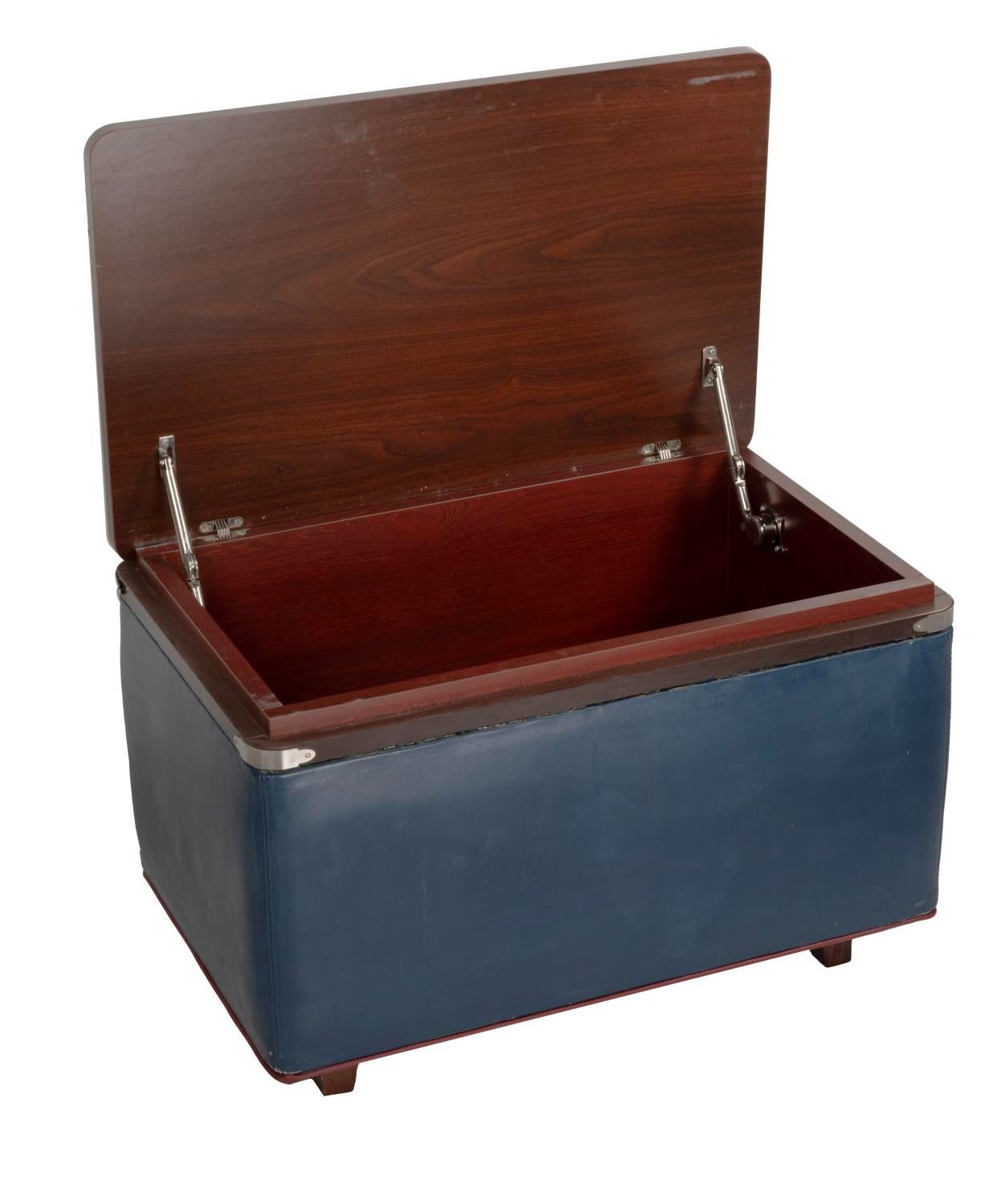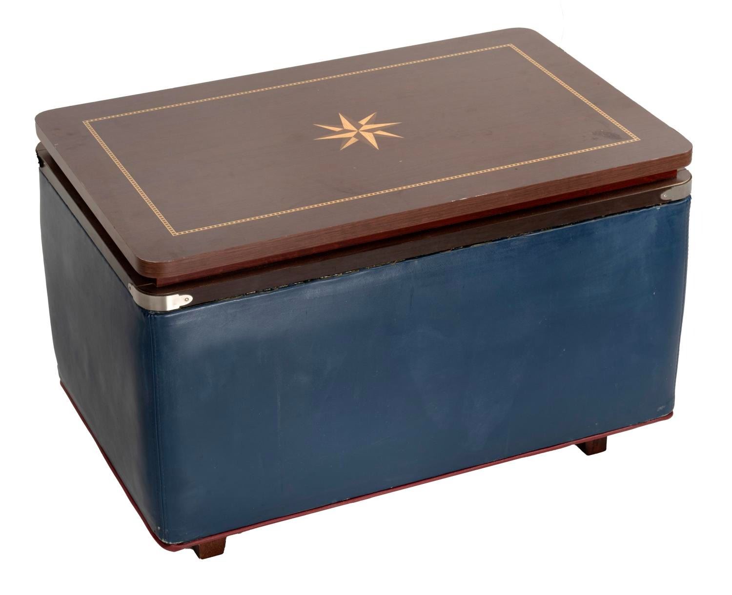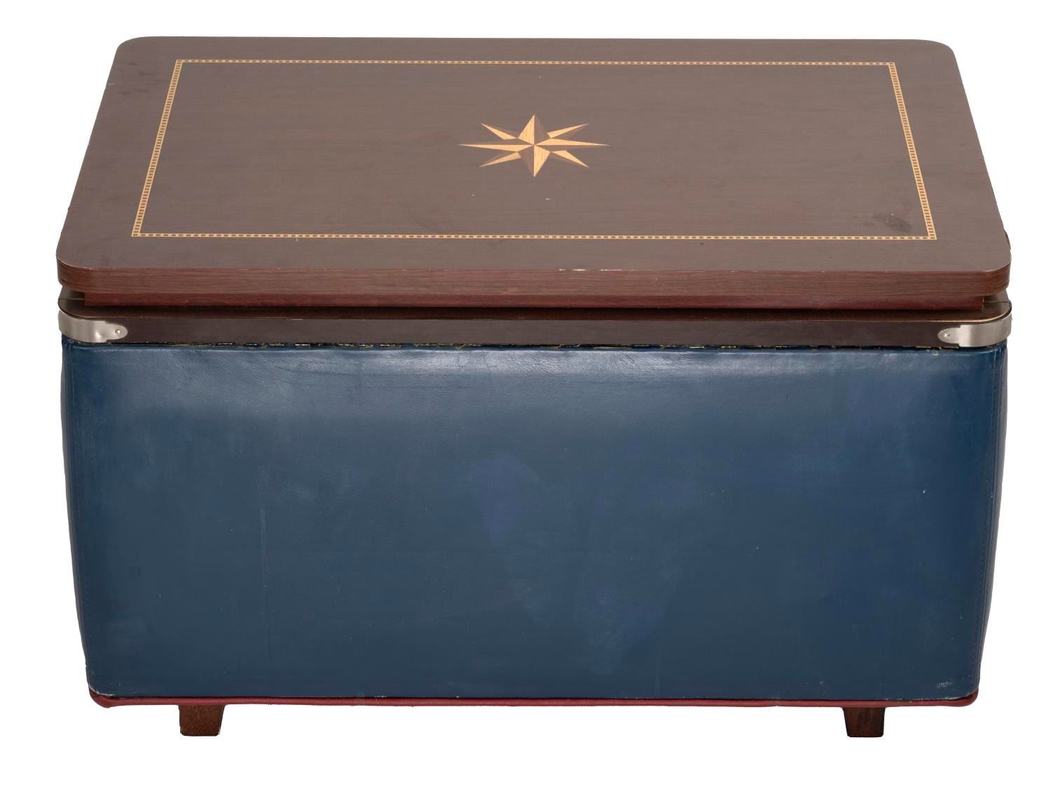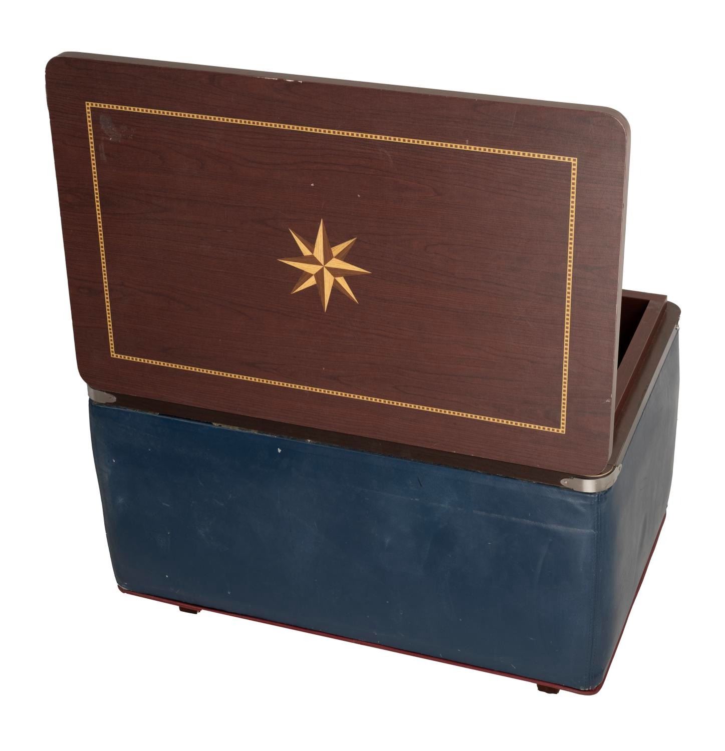 (Disney Cruise Line, 2010s-20s) An original Ottoman Chest from the Disney Dream Cruise Liner. This decorative ottoman chest features an eight-point faux parquet compass rose, particleboard construction with a hinged leatherette cushion lid and enclosed storage space with ventilation gratings within its base. Measuring 17"x17.75"x27", this functional and decorative accent is in good condition with scuffs, scratches, wear, and minor oxidation to its elements from Guest use.