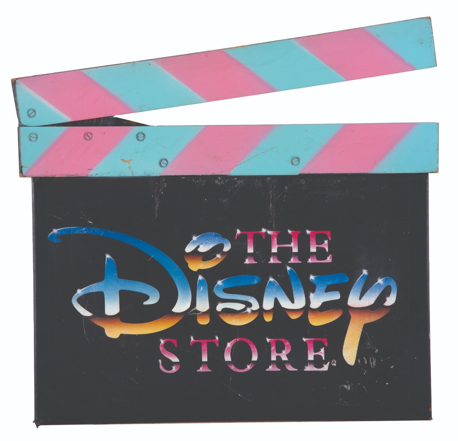 (The Disney Store, 1987-90s) A clapboard prop from an original location of The Disney Store. The Disney Store opened with motion picture themed displays featuring popular Disney Characters. Measuring 15.75"x13.25", this wooden and paper prop is in good condition with chips, surface wear, and scuffs to painted and paper elements.