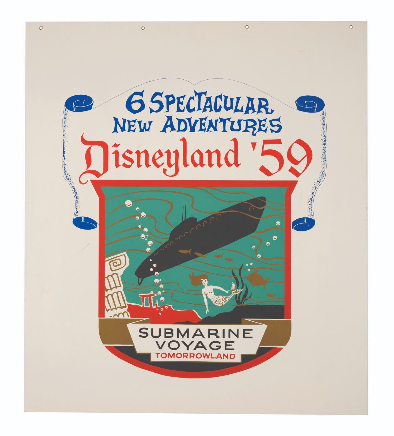 (Disneyland, 1959) An original silkscreened sign for the Submarine Voyage and "spectacular new adventures" at Disneyland. This type of sign was hung over Main Street, U.S.A., and on lampposts during the opening of new attractions at Disneyland in 1959. Measuring 26.5" x 30", the artwork on masonite is in very good condition, despite the slightest scuffs and wear to painted areas, edges, and corners.