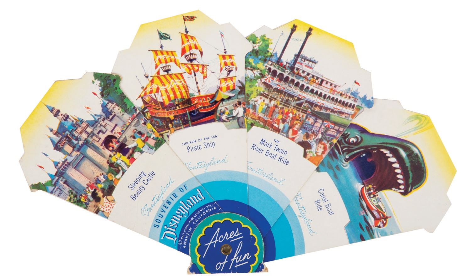 (Disneyland, 1955) An early paper fan souvenir of Disneyland. These folding fans were sold at the many souvenir kiosks throughout Disneyland in 1955 and 1956. Both sides of the fan depict early attractions including the Canal Boat Ride, Tropical River Ride, and Skyway, in brightly colored illustrations. Decades later, replicas of this memorable fan were reissued as D23 Membership Gifts, but originals like these are extremely rare. Measuring 6.75"x3.75" when closed, the fan is in good condition overall with few small stains, creases, and minor wear to its leaves.
