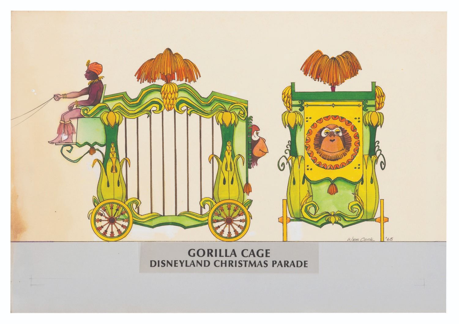 (WED Enterprises, 1964-65) An original Gorilla Cage wagon float concept design for the Disneyland Christmas Parade. Created by Disney Imagineer Floyd Wesley "Wes" Cook, the pen and watercolor drawing features a float design that would have been created between the March of Toys and the Fantasy of Parade versions of the Disneyland Christmas parade in 1964-65. Measuring 8.5" x 17" on 13.5" x 19.75" illustration board, the artwork is in good condition with discoloration, staining, and white out spots from corrections during production. The piece has had an acetate title block added that does not appear to be original to the artwork.