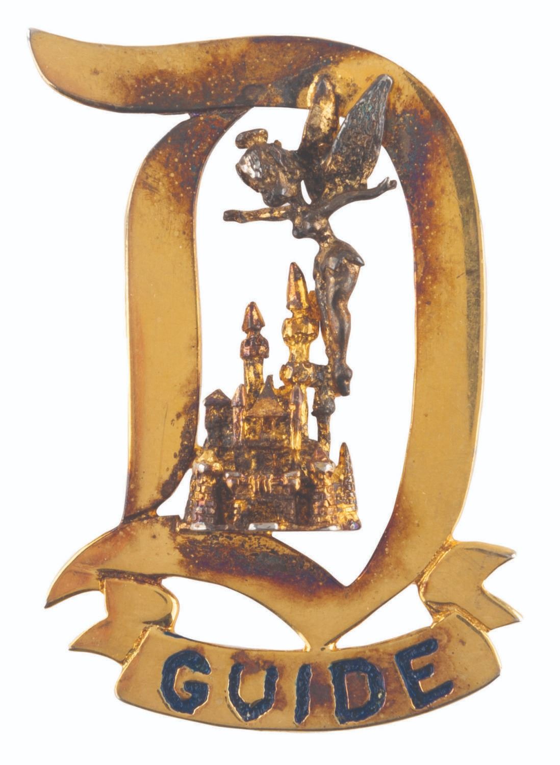 (Disneyland, 1958) An original Disneyland Tour Guide pin featuring Tinker Bell and Sleeping Beauty Castle, from the very start of the program. This first generation of the pin features an almost V-like "u" in "guide" and is made of gold-plated sterling silver. Measuring 1.25" x 2", the pin displays in good condition with wear from Park use and heavy oxidation from age.