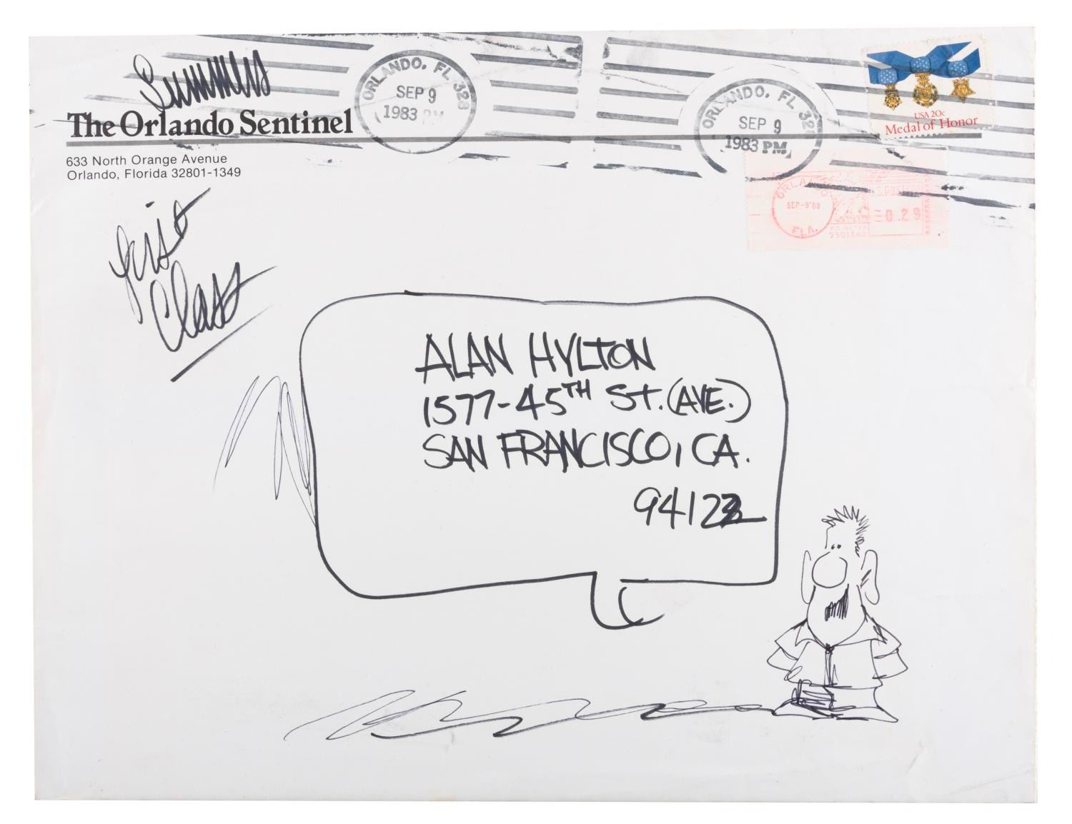 (Summers, 1983) An original drawing on an envelope by editorial cartoonist Dana Summers. Accomplished in felt tip, the 2.75" x 1.75" drawing on 10" x 13" envelope is in very good condition, with typical wear from mailing.