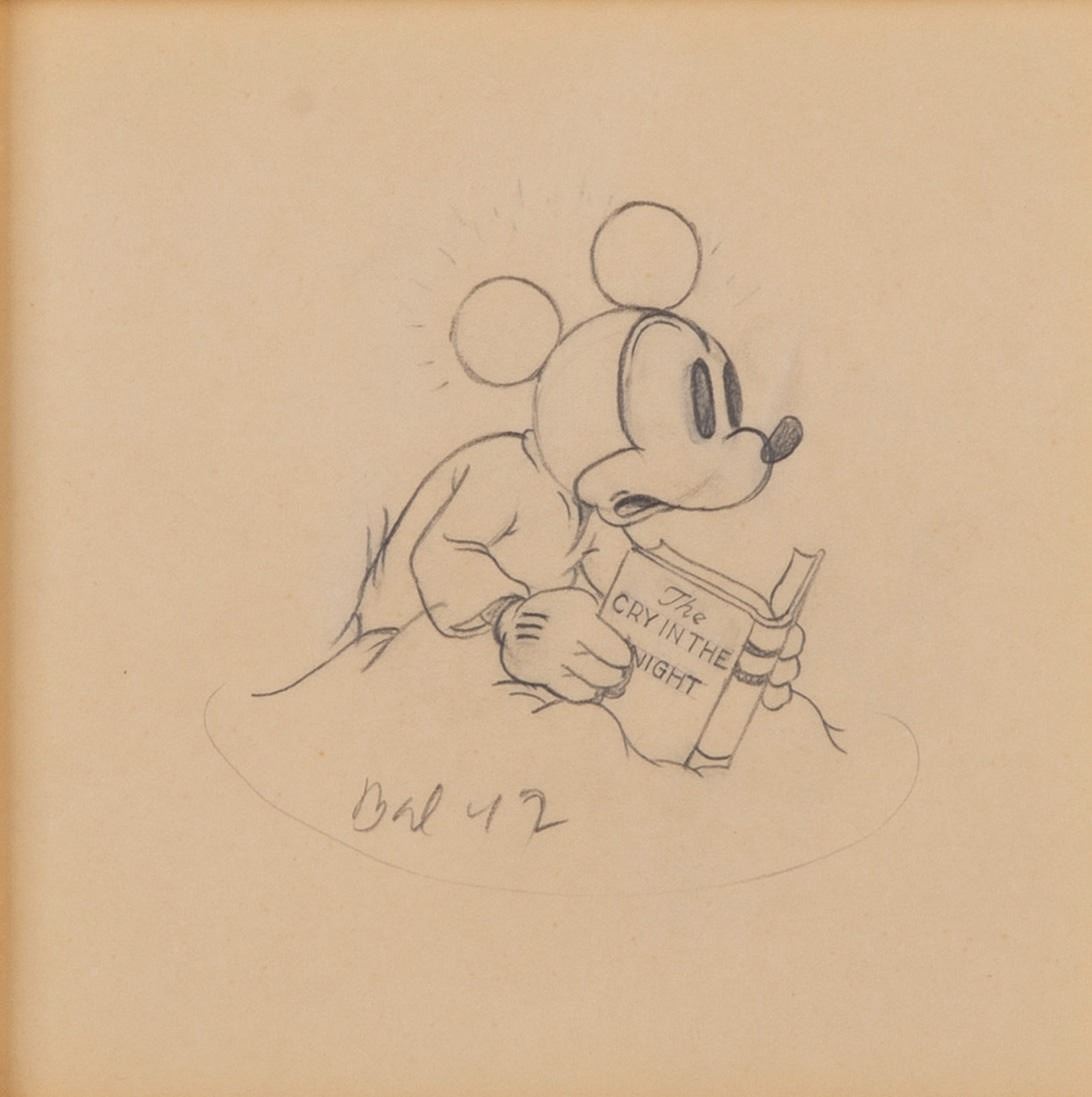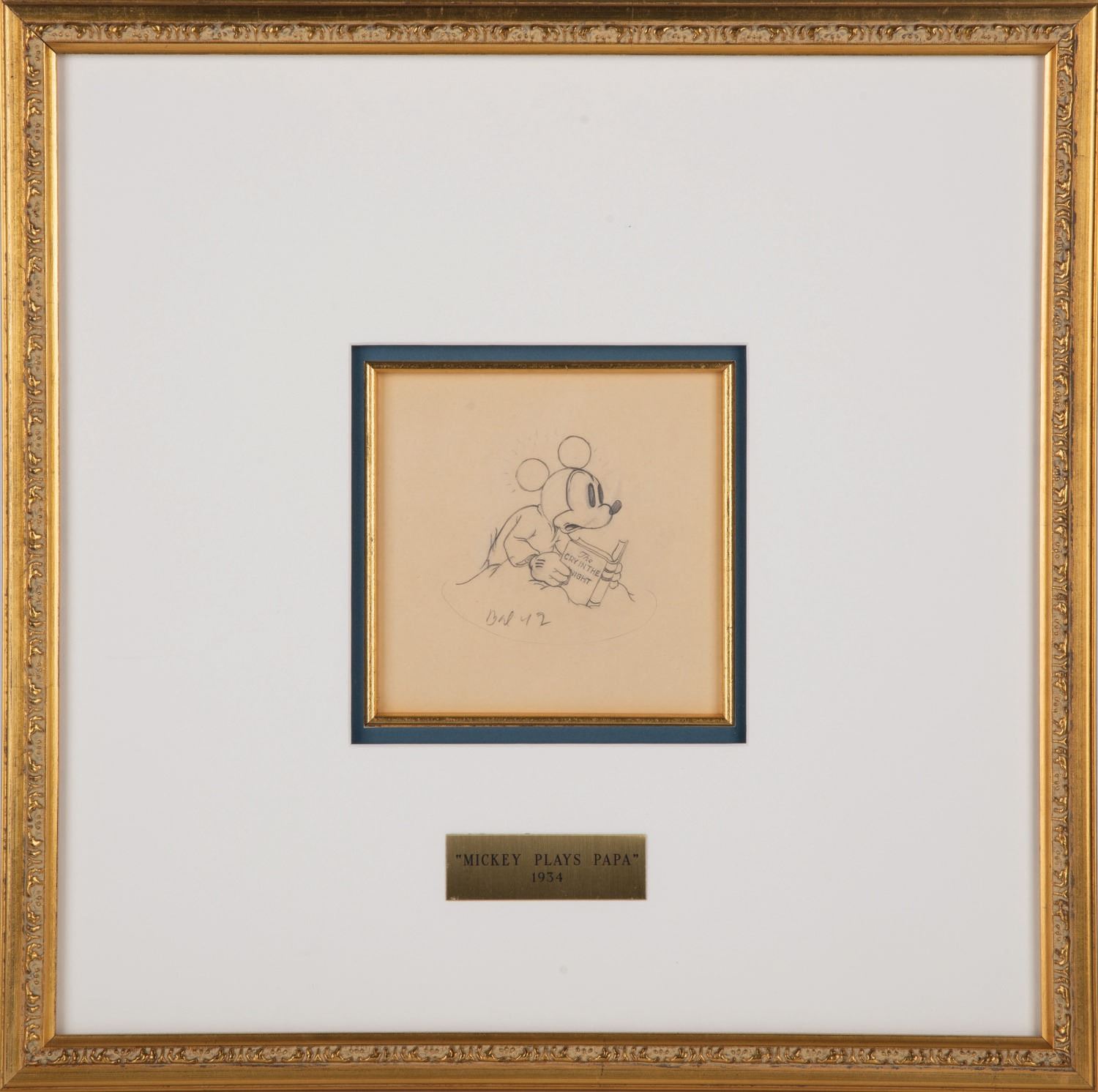 (Disney, 1934) An original production drawing from "Mickey Plays Papa." The piece has an image size of 3.25"x3.25" . The piece is framed with a mat opening of 5.25"x5.25" in a 16.25"x16.25" frame. The drawing and frame are in good condition with yellowing to the drawing from age and wear to the frame.