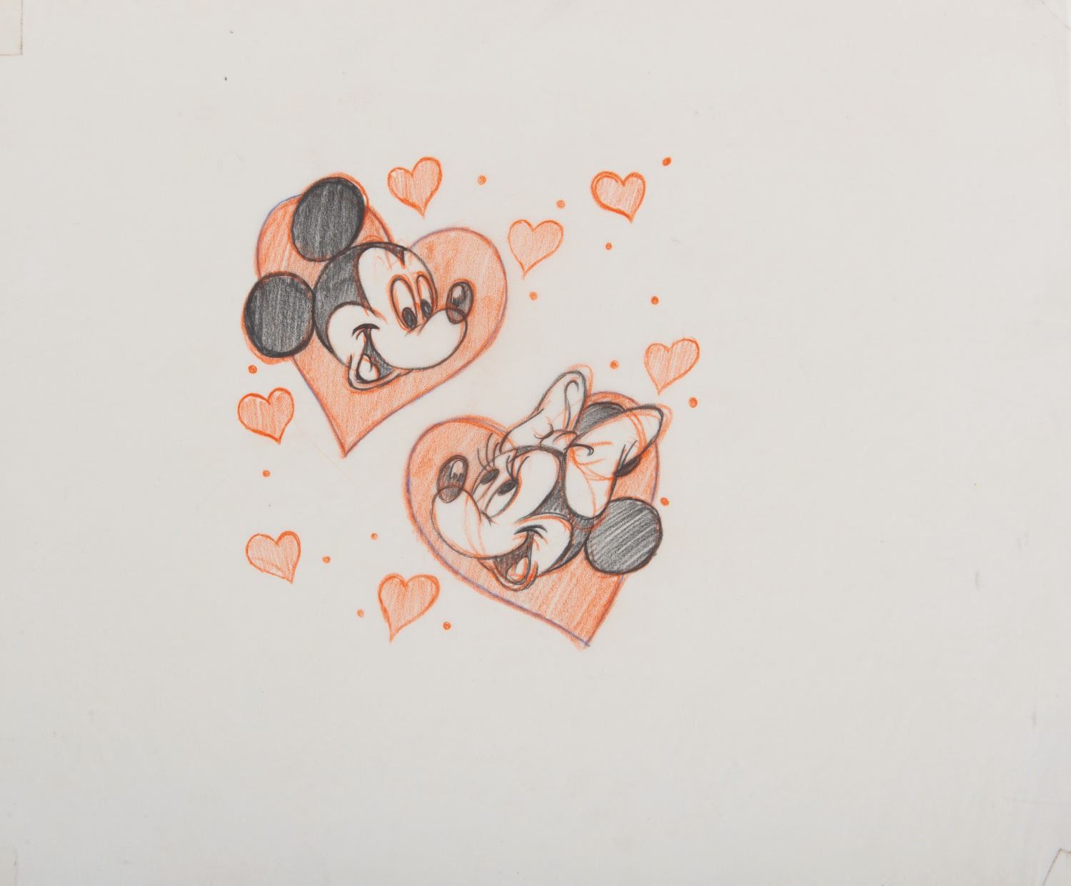 (Disney, 1986) An original drawing of Mickey Mouse and Minnie Mouse with hearts. The piece has an image size of 8"x7.25" on its 14"x17" animation paper and displays in overall very good condition with some surface wear.