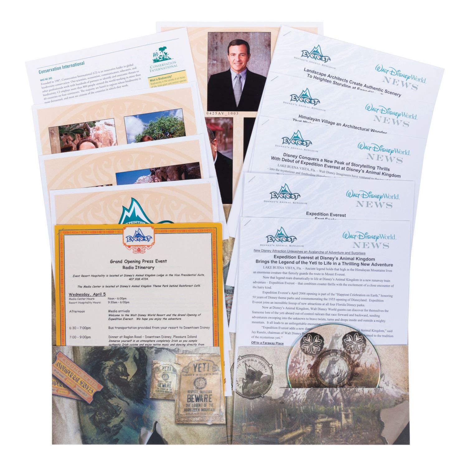 (Disney's Animal Kingdom, 2006) A Press Kit for the Grand Opening of Expedition Everest at Disney's Animal Kingdom. Among the kit are numerous releases, event itinerary sheets, Conservation International publication related to the Himalayas, WDW News photo materials, and a high resolution CD of images by Walt Disney World Media Relations. The materials come within original colorful and embossed commemorative folder featuring the attraction on the cover and a thematic mailing envelope. Measuring 11"x8.5" the sheets are in fine condition within 9"x12" fine condition folder and 10"x13" mailer, with little apparent wear.