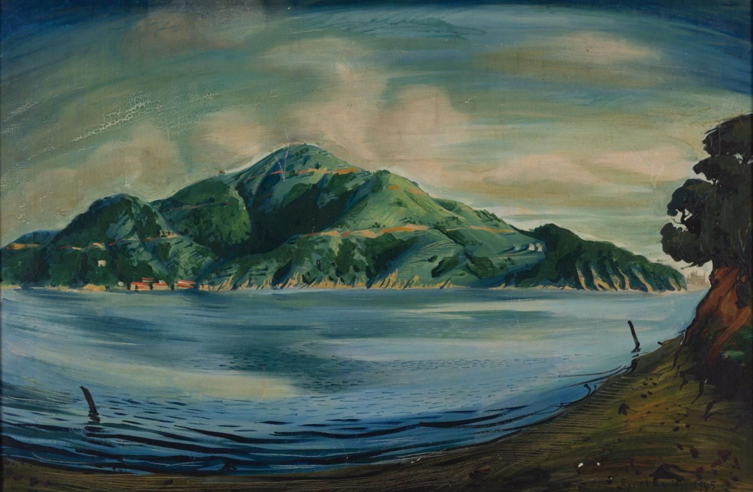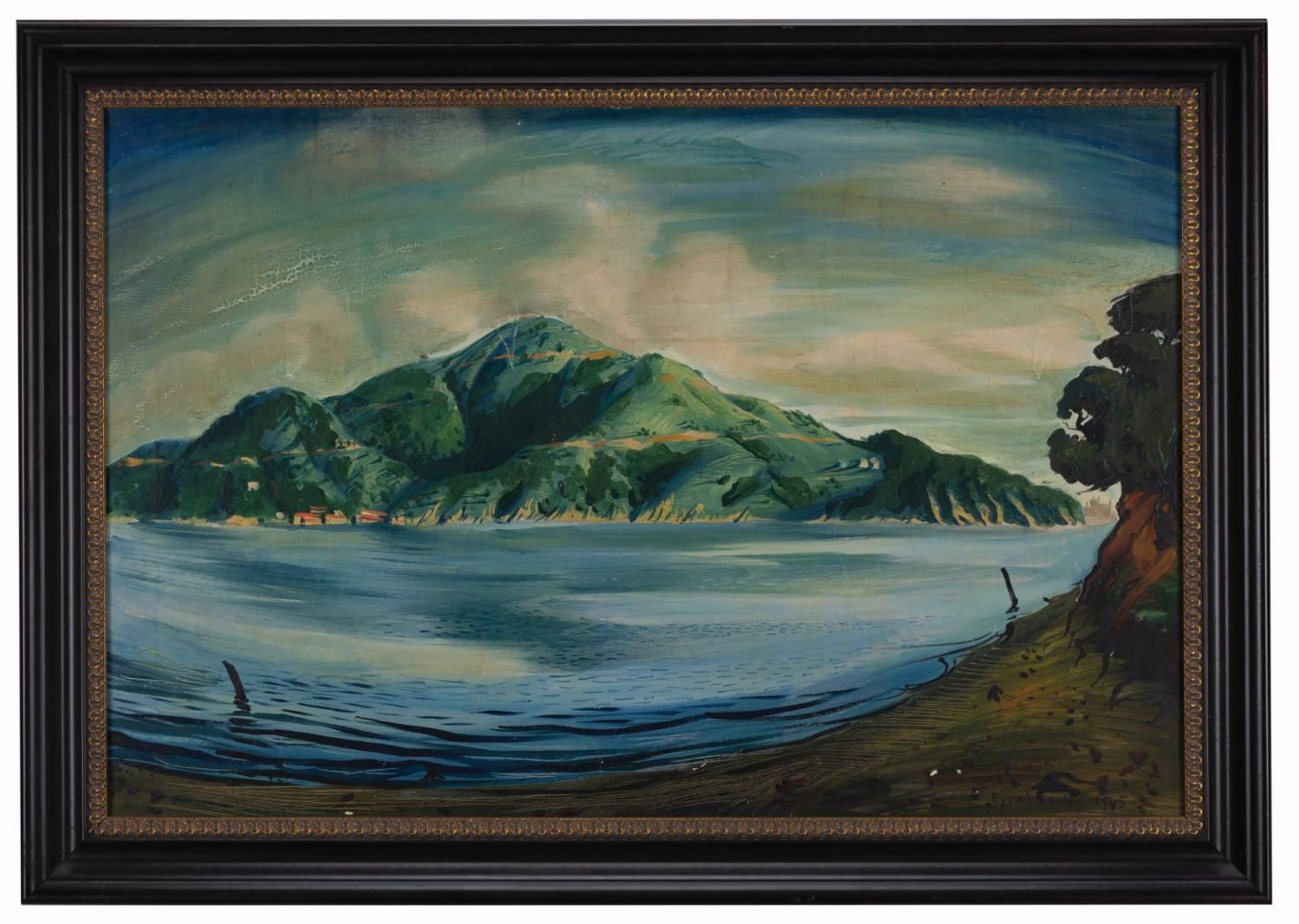 (Earle, 1945) An original painting signed by Disney Legend Eyvind Earle. At the age of ten, Earle's father challenged him to read either 50 pages of a book or create a painting each day. It is said that Earle managed to do both. This original scenic painting, created by the 29-year-old Earle, showcases the development of his style, which ultimately defined the look of Disney's "Sleeping Beauty." Measuring 19.5" x 29.25" visible in a 24" x 34" frame, the oil on canvas painting is in fair to good condition with some small chips to the paint, a few thin scratches, and some small drying cracks, which can be fairly common in oil paintings.