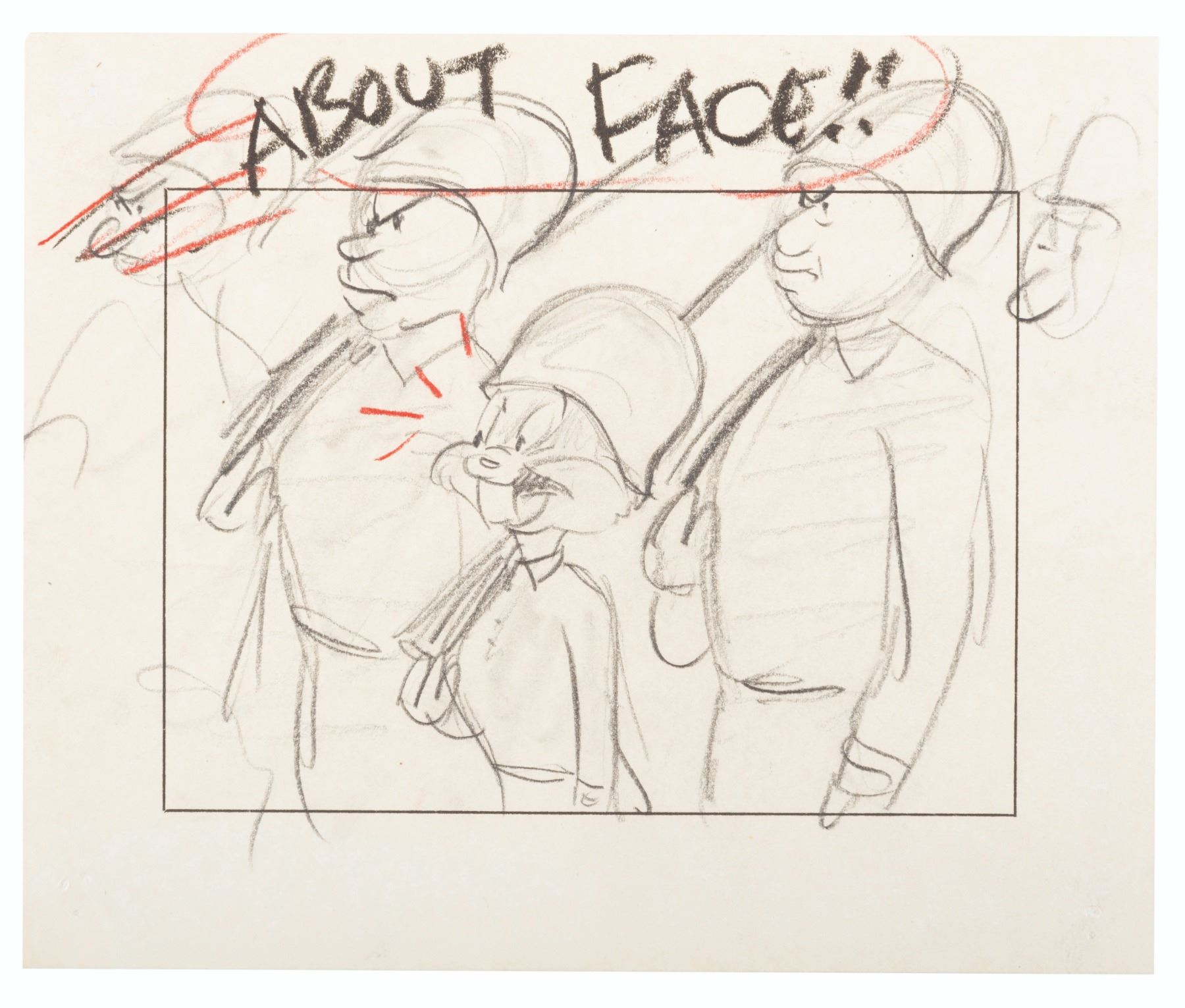 (Warner Bros., 1953) An original storyboard panel featuring Bugs Bunny from the Looney Tunes short “Forward March Hare.” Accomplished in graphite and colored pencil, possibly by Chuck Jones, and measuring 5.75” x 7”, the panel is in very good condition with light edge wear and pinholes from production use, and light discoloration from age.