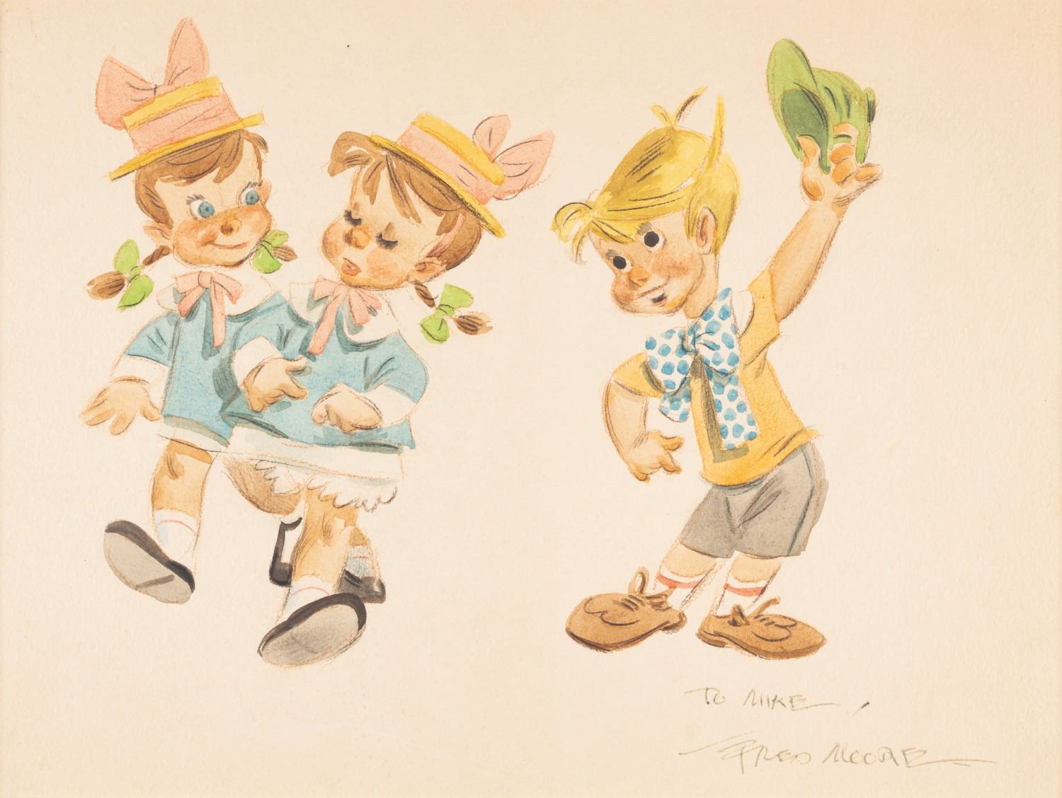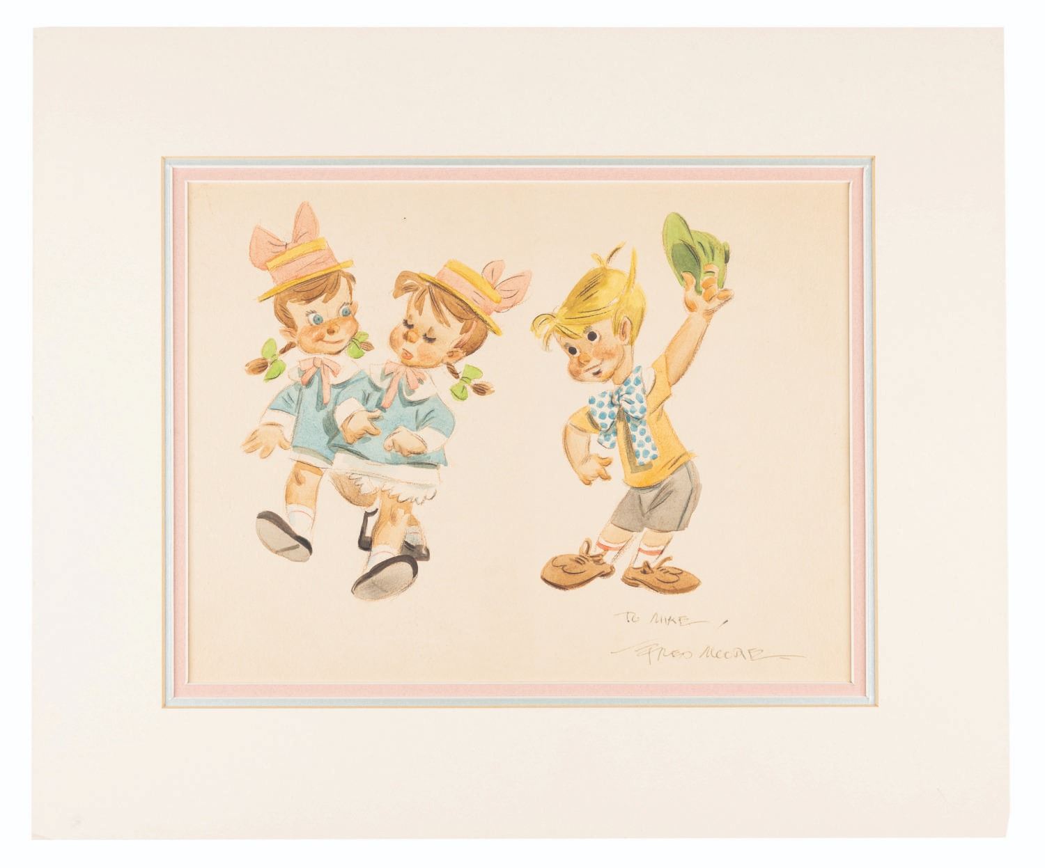 (Moore, 1940s) An original painting of three children by Disney Legend Fred Moore. A natural character artist who was responsible for Mickey Mouse's redesign in 1940's "Fantasia," Moore was known at the Studio for gifting original art of children or pin-up style "Moore's Girls" to other employees and visitors. This piece is signed by Moore with a dedication to "Mike." Accomplished in watercolor and colored pencils, the painting has an image size of 7.25" x 8.5" on 10" 13.25" artboard with a 14.5" x 17.5" matte, and is in fine condition with slight browning overall from age.