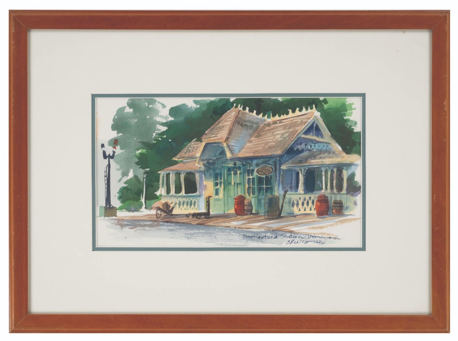 (WDI/Disneyland, 1996) An original "Frontierland Station" painting by Walt Disney Imagineer Chris Runco. For more than 30 years, Walt Disney Imagineering Concept Designer Chris Runco has contributed special effects, show, and dimensional designs for Disney Parks worldwide at Disneyland Resort, Walt Disney World, and Tokyo Disneyland. Here, Runco's artwork perfectly preserves the Frontierland Station Depot after its move in 1962, along with its antique Train Order Signal and woodland backdrop. Accomplished in watercolor on paper, the artwork has been matted for display within a 20"x14.5" frame, and is in fine condition.