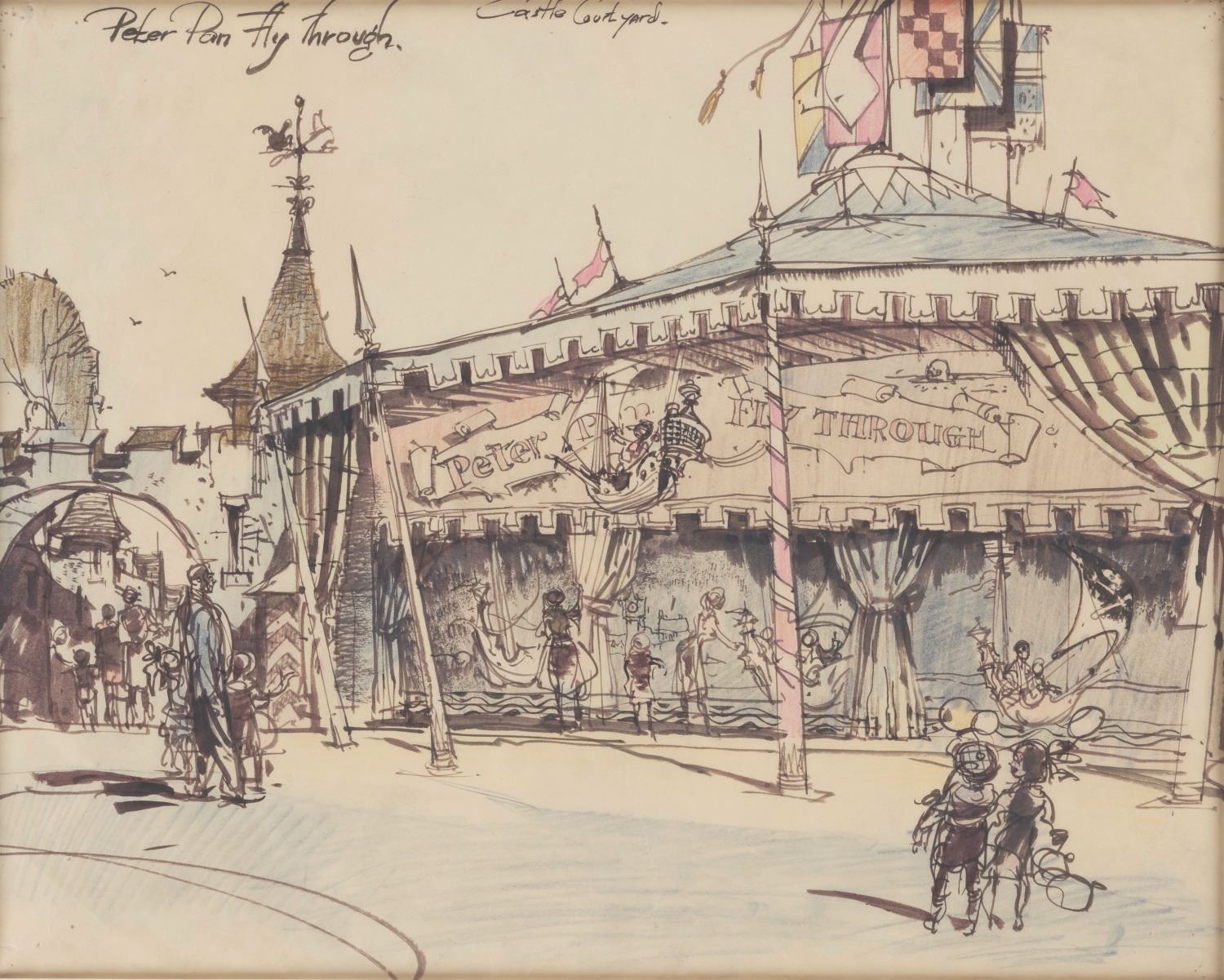 (WED/Disneyland, 1954) An original conceptual drawing for the "Peter Pan Fly Through" by Disney Legend Herbert Ryman. This original concept artwork was created in 1954, and depicts the attraction's medieval-themed entrance, complete with banners and bunting, within the Castle Courtyard. Contemporary Guests of Disneyland Resort may be familiar with this historic piece, which has been honored through framed prints on display throughout the Disneyland Hotel. A few of those rare prints have occasionally come to auction through Van Eaton Galleries in the past. This original mixed media composition has been accomplished in pen and ink with colored pencil. It is featured on page 157 of the biographical "A Brush with Disney - An Artist's Journey" by Bruce Gordon & David Mumford (Camphor Tree Publishers,2000) . The artwork was on display at the Disneyland Gallery in late 2000. This iconic piece has an image size of 14.75"x11.75" and has been matted for display within a 21.25"x17.5" frame. It is in fine condition, exhibiting faint creases, expected fading to colors from age, and pinholes from the original production display.