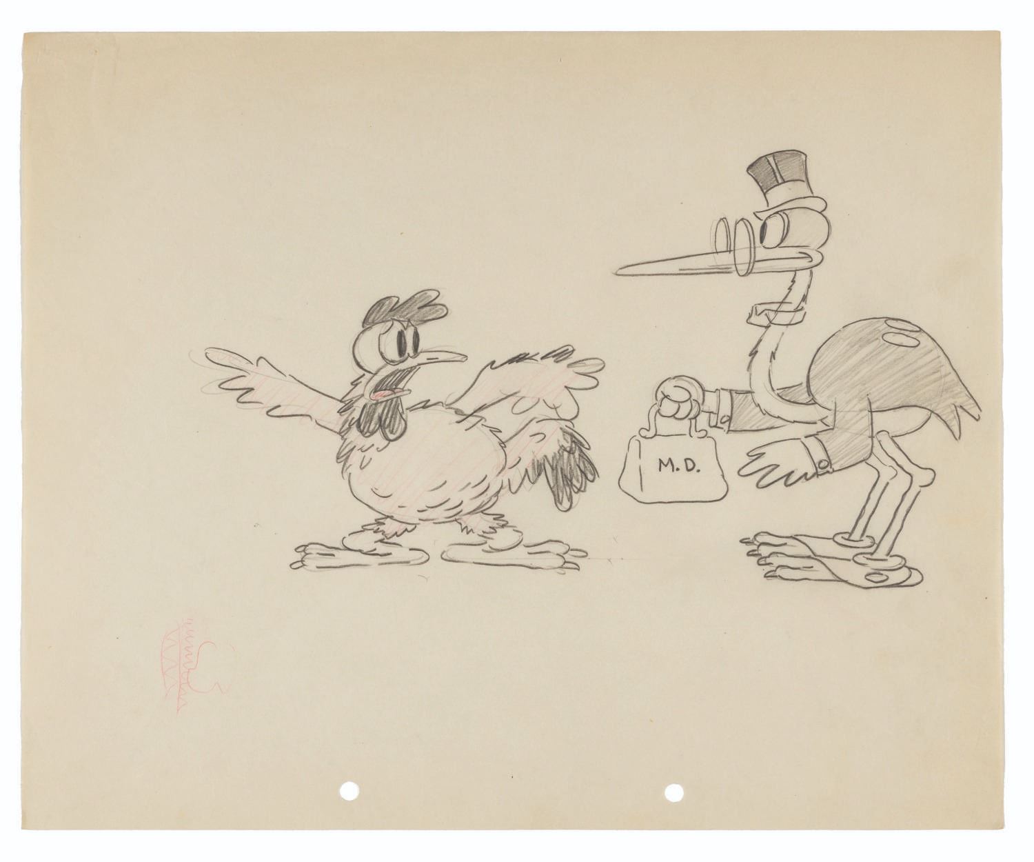 (Harman-Ising, 1932) An original production drawing from the Merrie Melodies short “I Wish I Had Wings.” Accomplished in graphite and colored pencil and measuring 9.75” x 12” with a character image size of 5.25” x 9.5”, the drawing is very in good condition with light creasing and edge wear, and light discoloration from age.