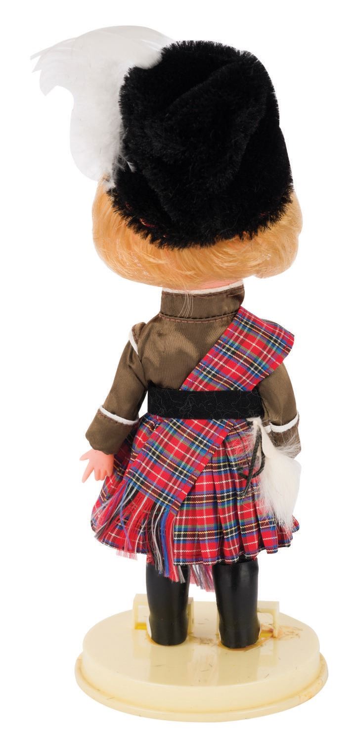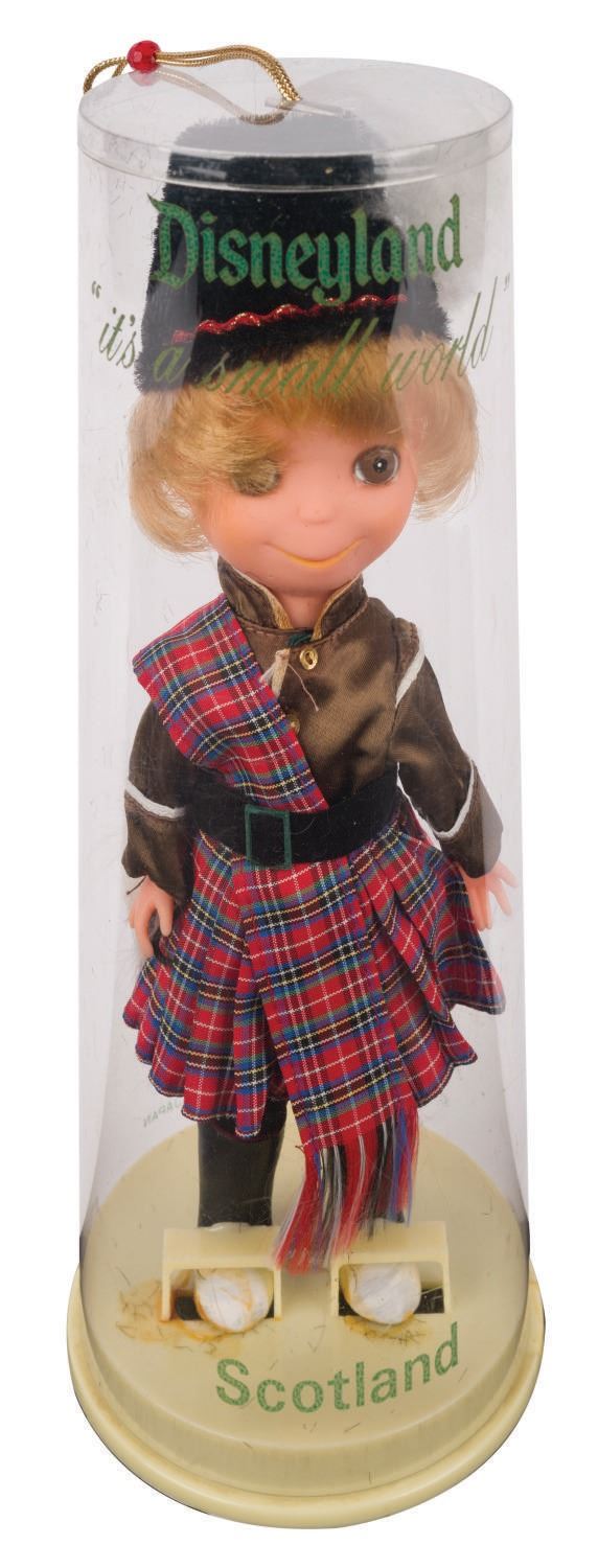 (Disneyland, 1966) An original souvenir doll "Disneyland- It's a Small World" Scotland doll based on one of "the Children of the World." The doll was released shortly after the attraction debuted and is themed after the Scotland segment. The doll measures 9" tall while the package is 9.75" tall and 3.75" at its widest diameter. The entire piece displays in fine condition overall with minor spots of discoloration and some synthetic fabric fibers on the base of the original container.