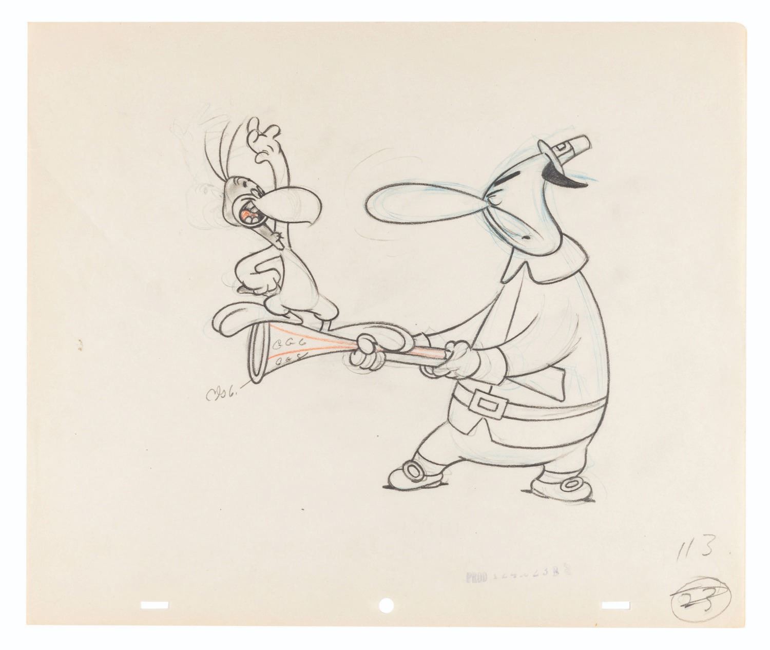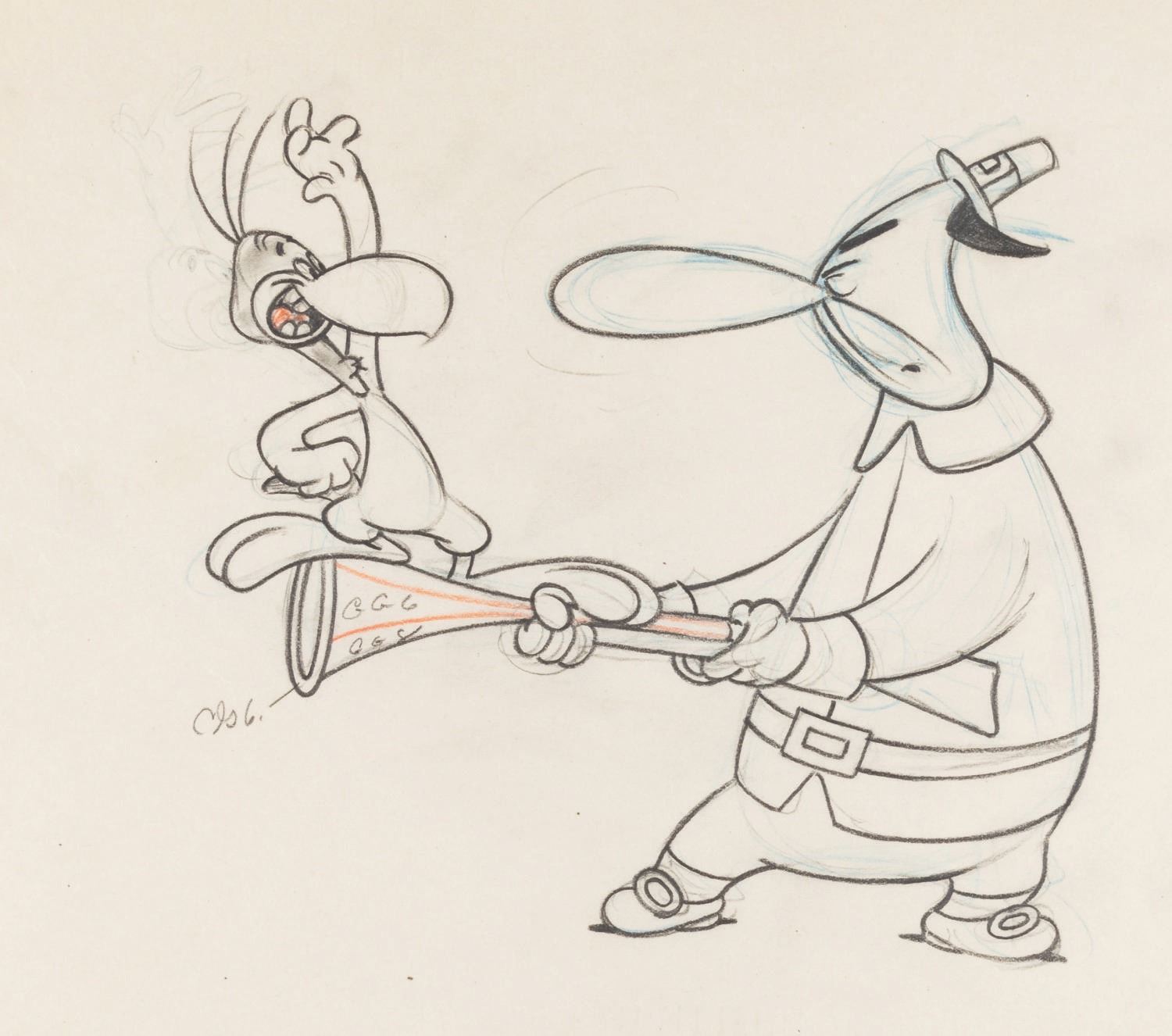 (MGM, 1945) An original production drawing from "Jerky Turkey," directed by Tex Avery. With an image size of 7.25” x 8.5” on 10.5” x 12.5” animation paper, the graphite drawing is in very good condition, with light wear from handling and age.