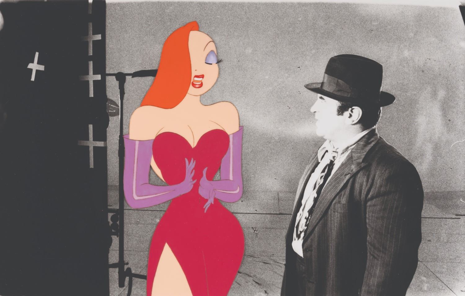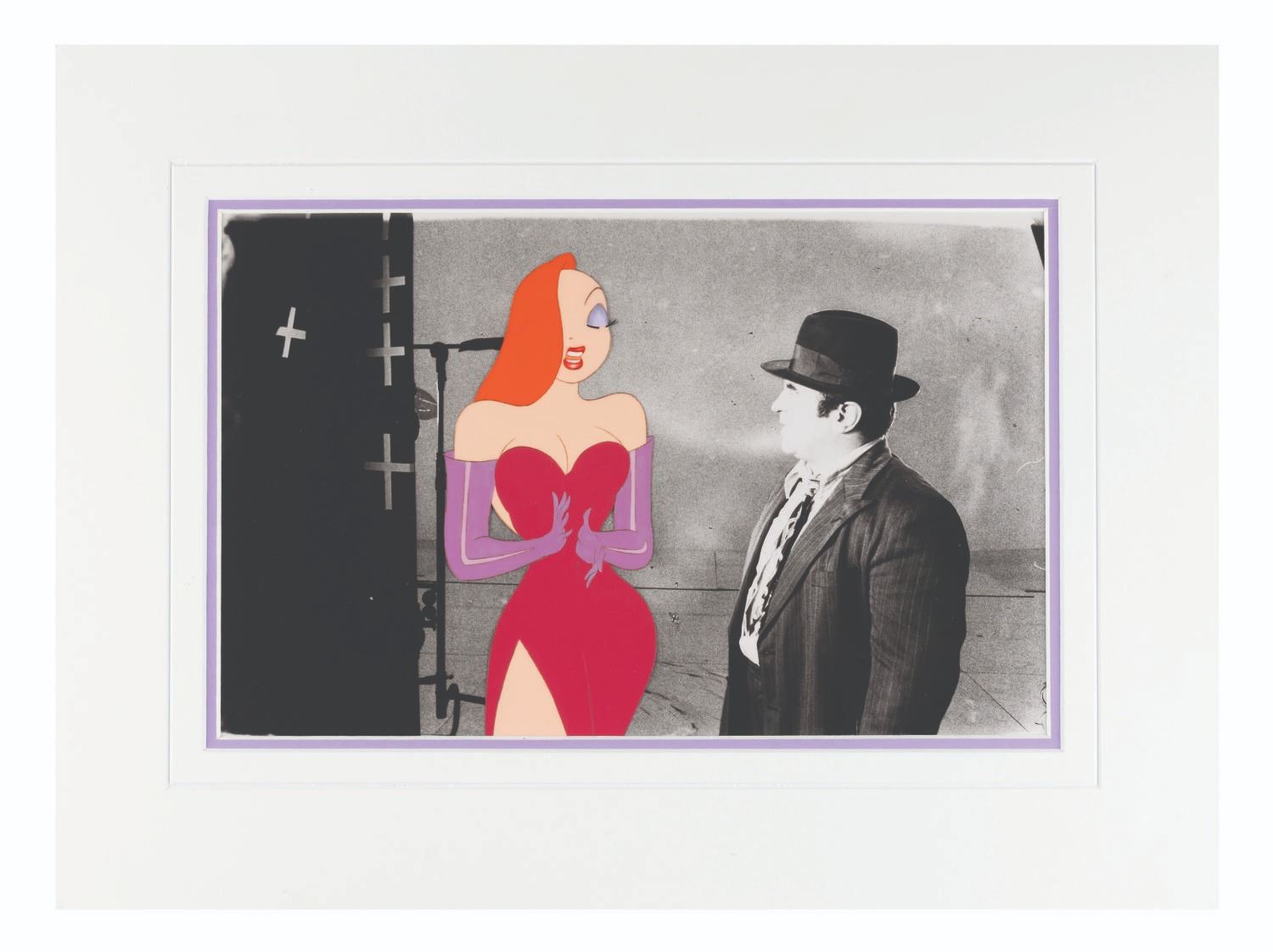 (Disney, 1988) An original production cel of Jessica Rabbit from "Who Framed Roger Rabbit?" The hand-painted cel is placed over a scene-matching photo of Bob Hoskins as the hero Eddie Valiant. The cel has an image size of 3.5” x 7.75" within its 8.25" x 13" matte opening. The artwork has not been examined out of the matte but appears to be in very good condition with 2mm of paint loss to Jessica’s eyelash.
