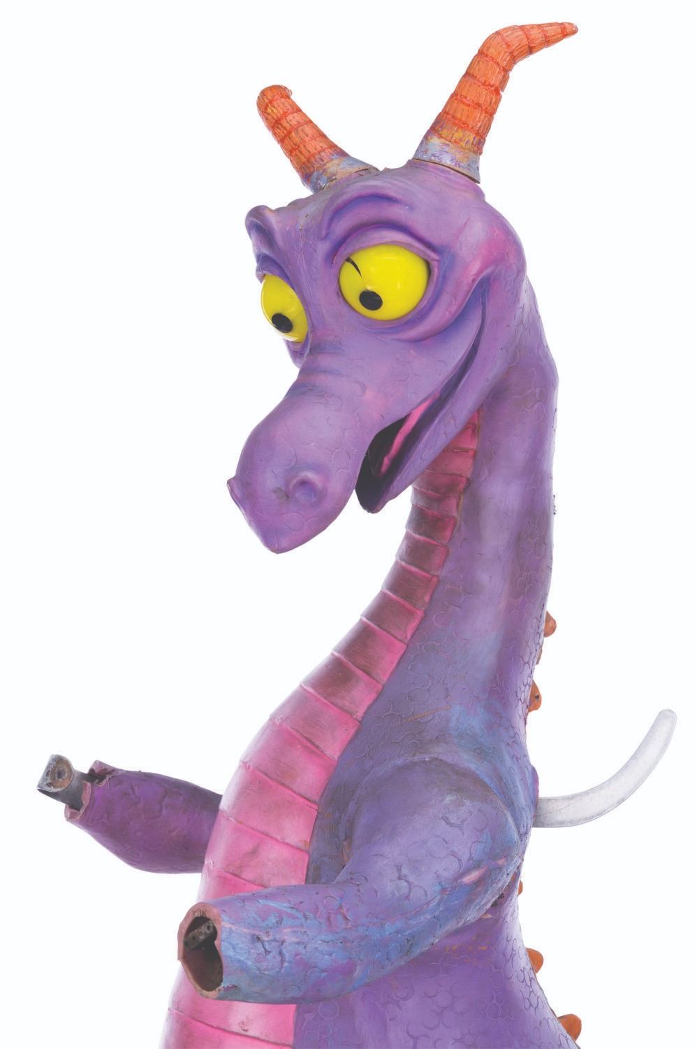 (EPCOT Center, 1983-1998) An Audio-Animatronic Figment from the original version of Journey into Imagination. Created by Disney Legend Tony Baxter and Imagineer Steve Kirk, the fondly-remembered attraction introduced Guests to the Dreamfinder and his companion Figment, a dragon of royal purple pigment filled with curiosity and childish delight. Together they traveled the universe searching for “sounds, colors, ideas - anything that sparks the imagination.” This figure appeared in the attraction's Dreamport scene, shoveling flowers in the room where all of Dreamfinder and Figment's ideas were collected. While Figment’s presence in the Park remains, it is this original iteration of the ride that made the biggest impact and inspires such nostalgia among fans. The animatronic is attached to a black metal base from Walt Disney Imagineering and would add one little spark to your Disney collection. Measuring 13” x 25” x 35” tall and 17” x 24” x 41.5” tall including the base, this lovable fellow is in good condition with exposed metal brackets from missing hands and wings, separation behind the left arm, stains, cracks including a 1” crack in the left eye, and wear from Park use, while the base exhibits oxidation, stains, and wear. Due to size and weight, this item requires special shipping arrangements. Please inquire before bidding.