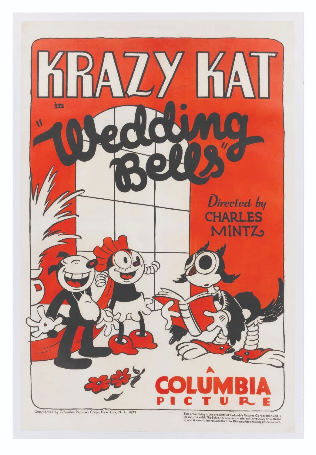 (Columbia, 1932) An extremely rare original one sheet poster from Charles Mintz's Krazy Kat short "Wedding Bells." Mintz reinvented the Krazy Kat character in the 1930s to compete with his former employee Walt Disney's Mickey Mouse. This short was animated by future Disney Legends Preston Blair and Al Eugster. Measuring 28” x 40.75” on a 28.75” x 42.5” linen backing for preservation, the vibrant poster displays in very good condition with some retouching, full-width horizontal creases, scratches, stains including a 5” stain near Krazy Kat’s name, and wear from age.