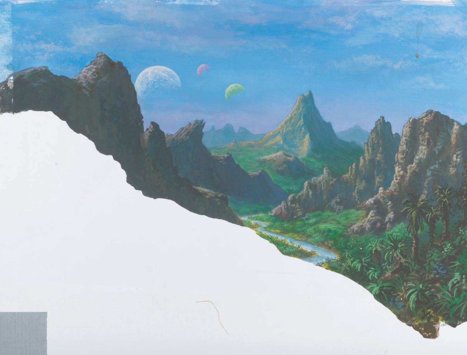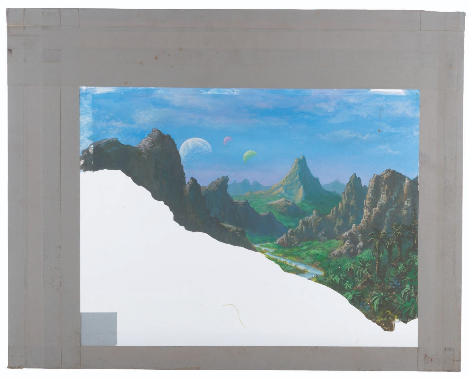 (ABC, 1991-92) An original matte painting from “Land of the Lost.” Based on the original Sid and Marty Krofft series from 1974-76, the show featured many special effects shots which used matte paintings like these to create the illusion of the characters standing in an expansive, prehistoric world. Painted by Charlie Chiodo with acrylic on glass, this matte painting can be seen in the intro of every episode. The image area measures 14” x 18” on the 19.5” x 24.5 glass. The matte painting is in good condition with typical wear from production use, light stains measuring between 0.25” and 1.5”, tape residue on the glass, and stains and soiling to the taped boarder.