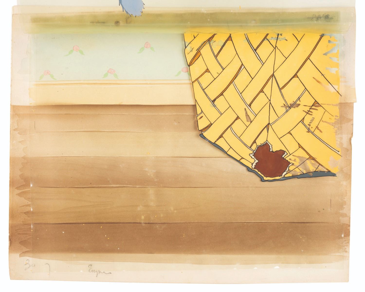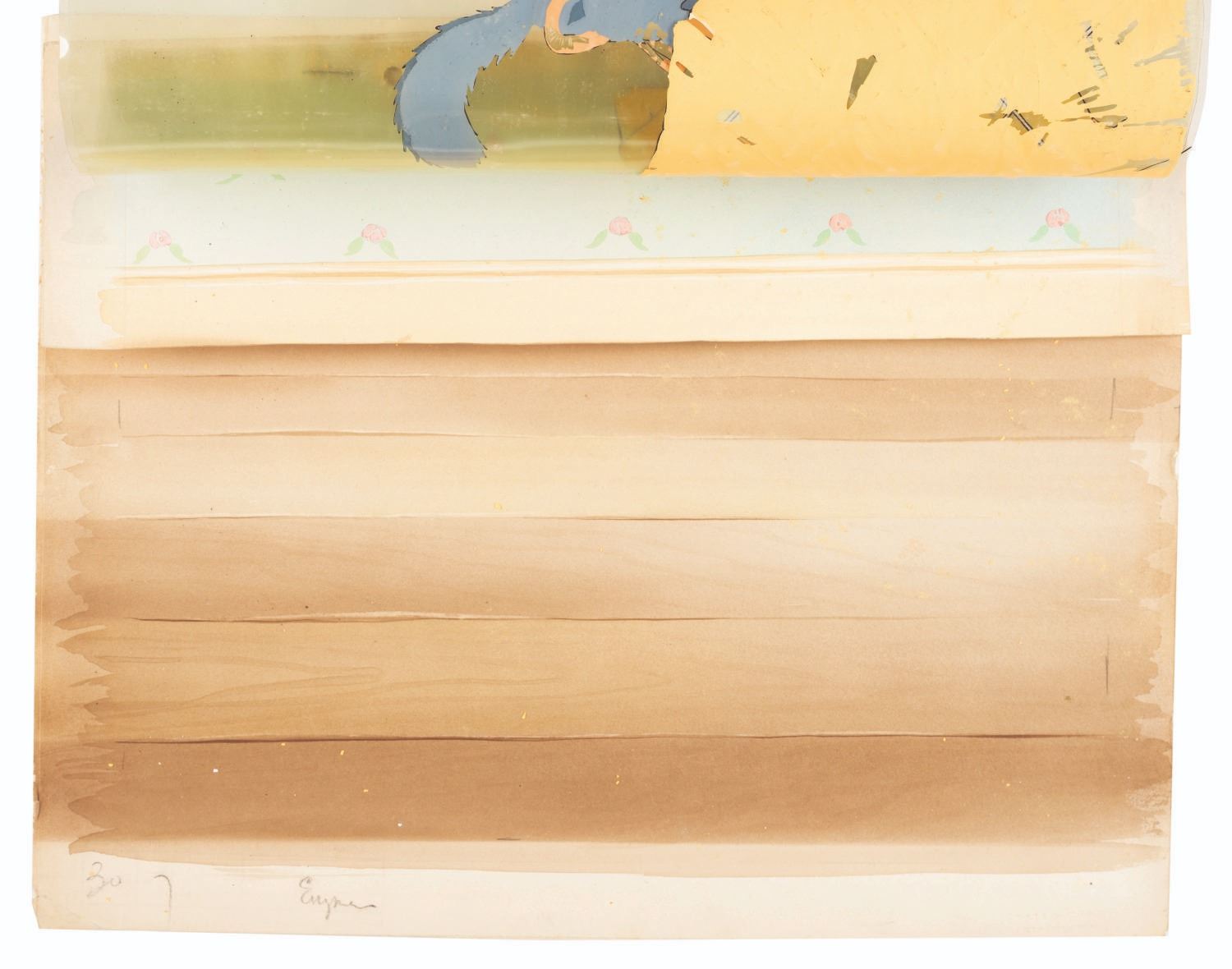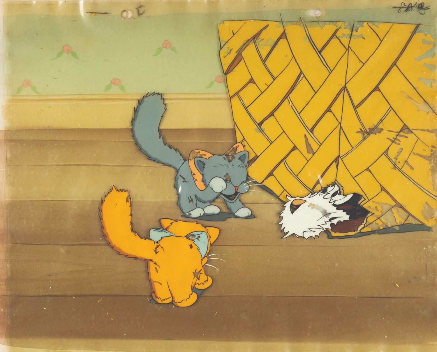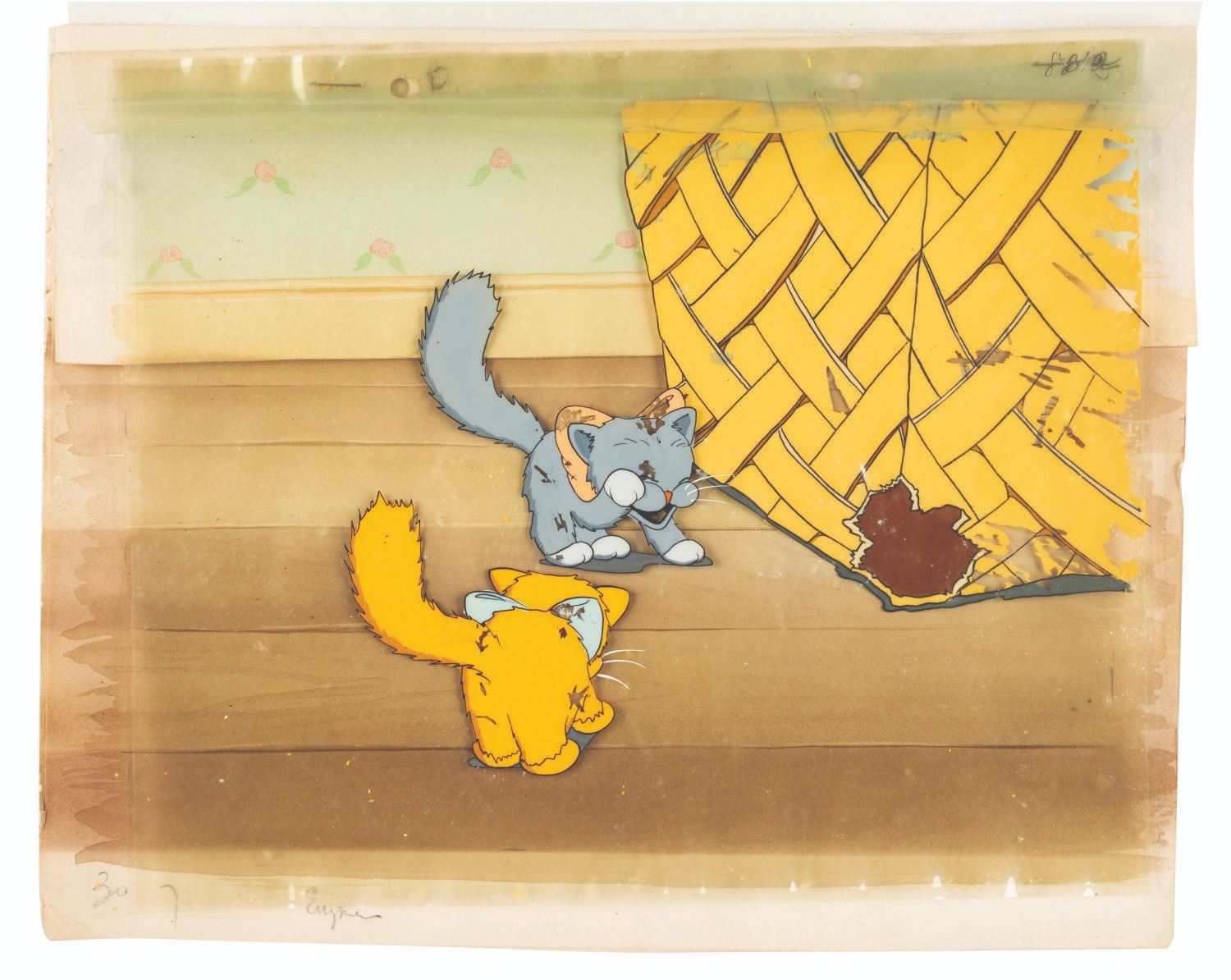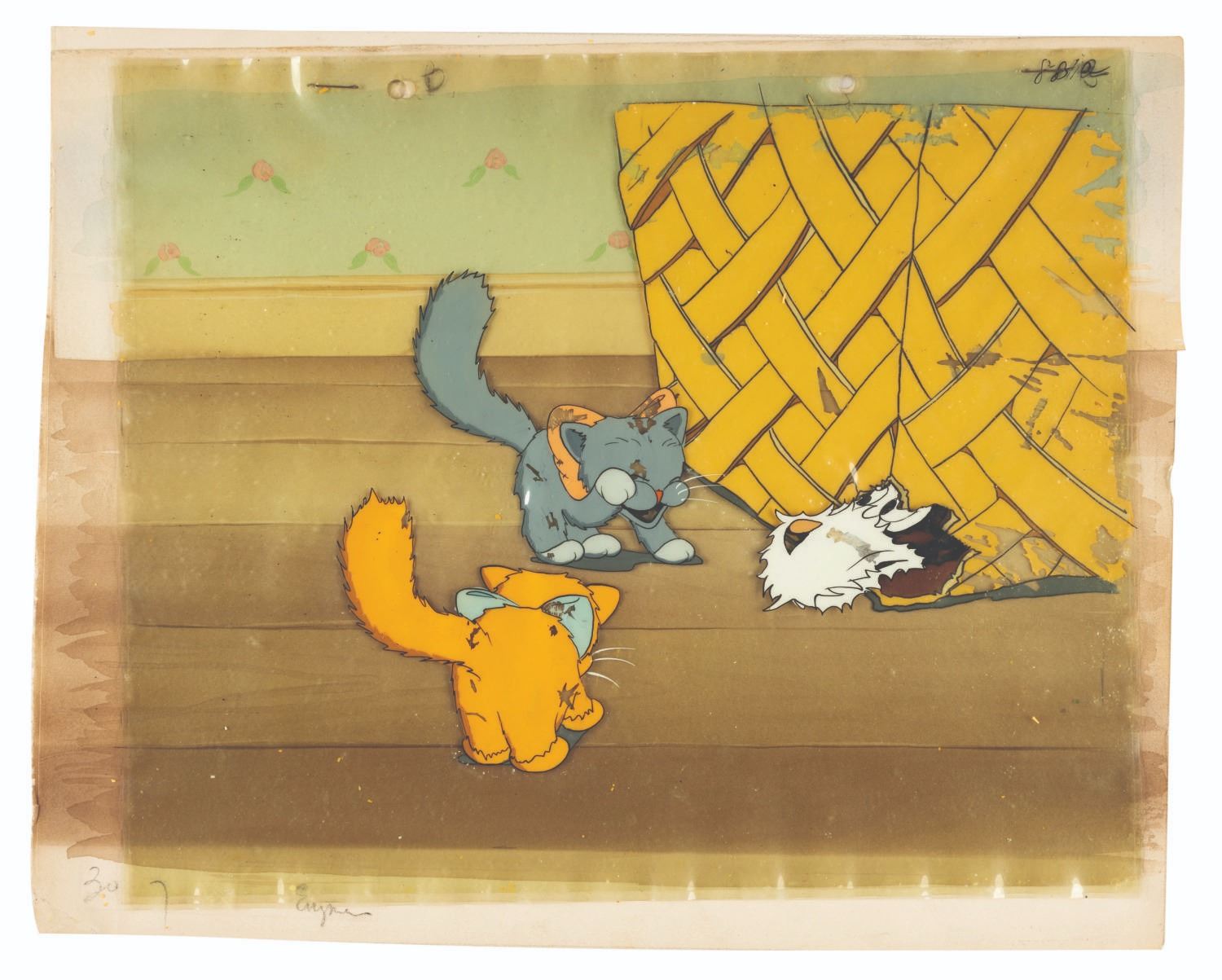 (Van Beuren, 1935) An extremely rare original multi-layer key master setup from the Rainbow Parade short "Merry Kittens" consisting of three frame-matched cels presented on the original, scene-matched, hand-painted background. The cels measure 11.75" x 9.5," and each exhibits paint loss along with warping and yellowing of the celluloid, but the colors of the paint are unaffected. The cels have two 0.5" staples along the top, securing them to the 10.5" x 13" background which shows edge wear and light creasing to the sides and corners from production use.
