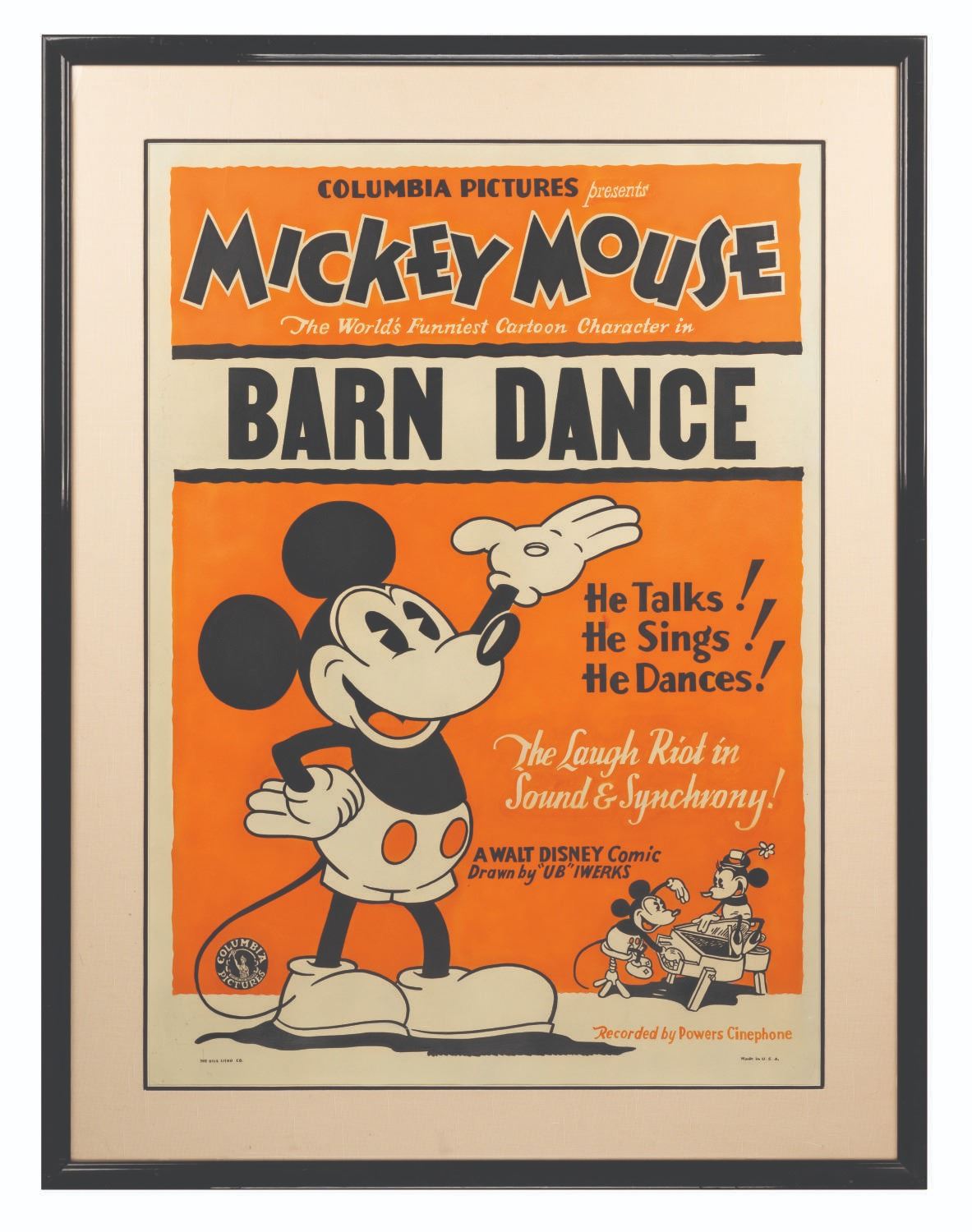 (Columbia, 1929) A rare Columbia Studios one sheet Mickey Mouse poster. Columbia distributed Disney's theatrical shorts between 1929 and 1932. This stock Mickey poster features the 1929 Mickey Mouse Short, "The Barn Dance." Posters from Mickey's early days before Disney made the switch from Columbia to United Artists are quite rare, but what makes this poster even more rare is that it mentions Ub Iwerks. By 1930, Iwerks had left Disney and his name was removed from further poster printings. Measuring 29"x42" the poster has been beautifully restored and mounted to linen. One of only a handful of examples we have seen, the poster is in fine condition.