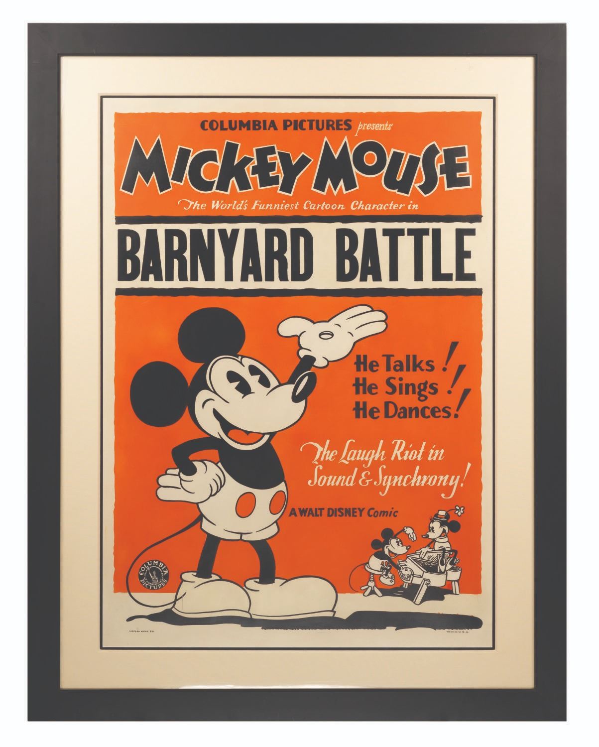 (Columbia, 1929) A rare Columbia Studios one sheet Mickey Mouse poster. Columbia distributed Disney's theatrical shorts between 1929 and 1932. This stock Mickey poster features the 1929 Mickey Mouse Short, "Barnyard Battle," however, it was probably printed after 1930 as it is missing Ub Iwerks' name. Iwerks left the studio in 1930 and his name was removed from later poster printings. Posters from Mickey's early days before Disney made the switch from Columbia to United Artists are quite rare. Measuring 29"x42" the poster has been beautifully restored and mounted to linen. One of only a handful of examples we have seen, the poster is in fine condition.