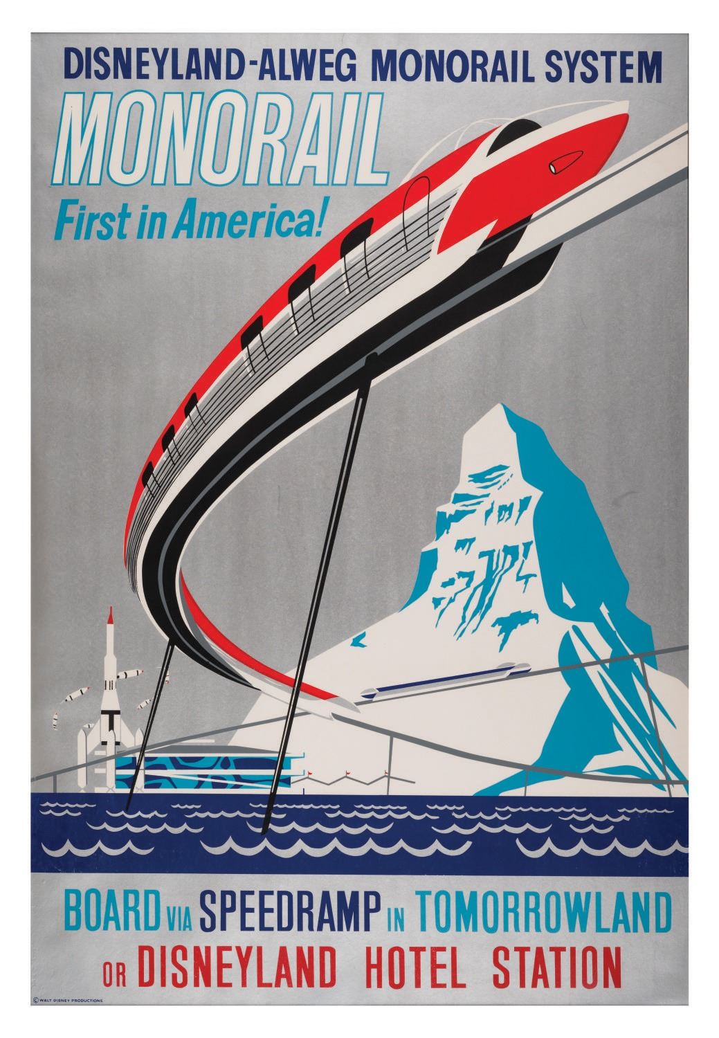 (Disneyland, 1967) An original hand-silkscreened poster for the Disneyland-Alweg Monorail attraction at Disneyland. This shimmering metallic-grey poster updates the 1961 poster designed by Paul Hartley and depicts the renovated Tomorrowland, including the Carousel of Progress and Rocket Jets attractions. Measuring 36"x54", the poster is in very good condition with few mild scuffs to the Lagoon water area and few creases throughout including one 3" crease within the upper right corner.