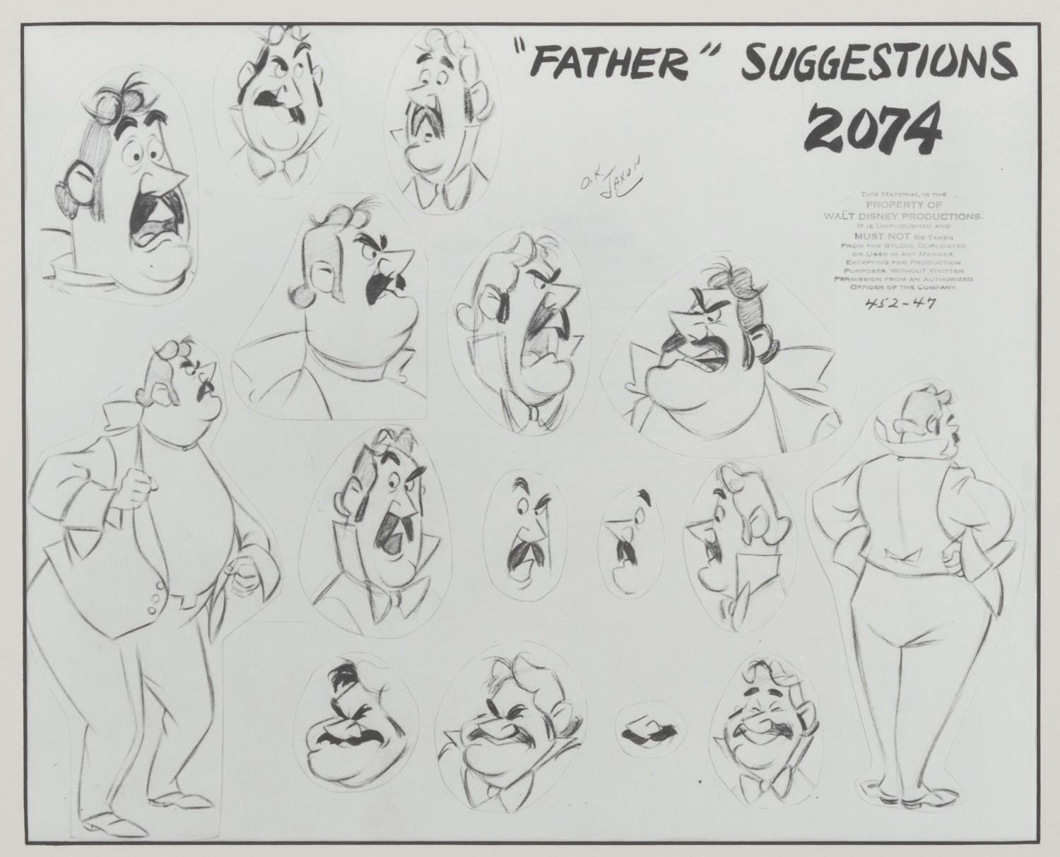 (Disney, 1953) A Studio-produced photostat model sheet of Mr. Darling for the 1953 feature film, "Peter Pan." Model sheets such as this were distributed to animators and crew working on the film so that everyone could draw the character the same way. The sheet measures 11” x 14” in an 18” x 20.5” frame and is in good condition with a very light crease along the bottom.