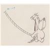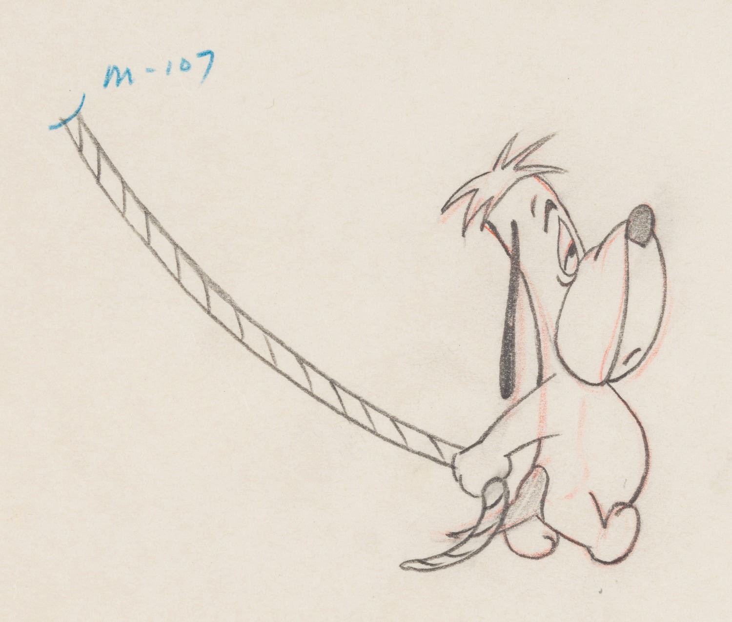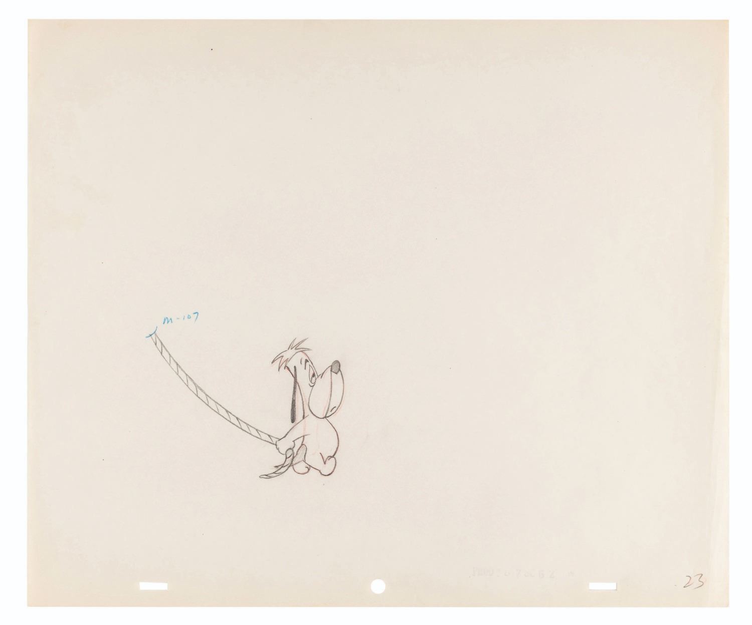 (MGM, 1949) An original production drawing of Droopy from "Out-Foxed," directed by Tex Avery. Accomplished in pencil with an image size of 3.75” x 3” on 10.5” x 12.5” animation paper, the drawing is in very good condition with very faint smudging and wear from production use.