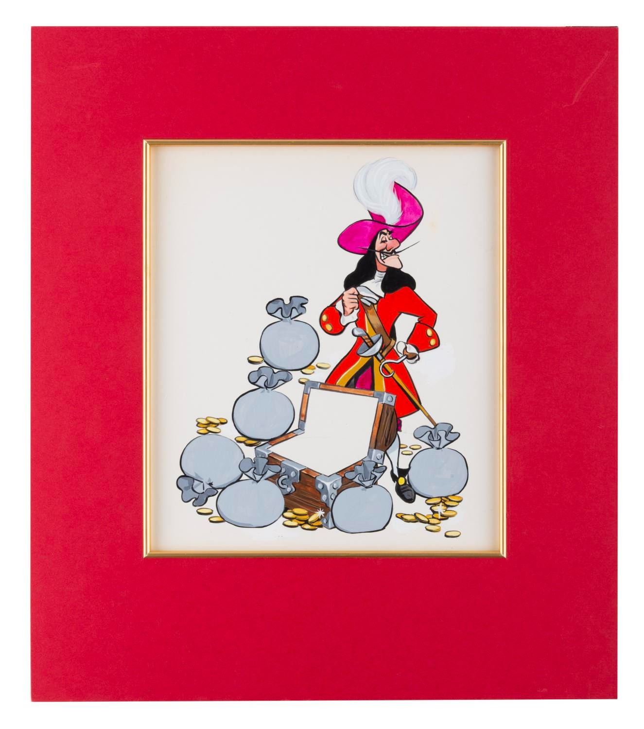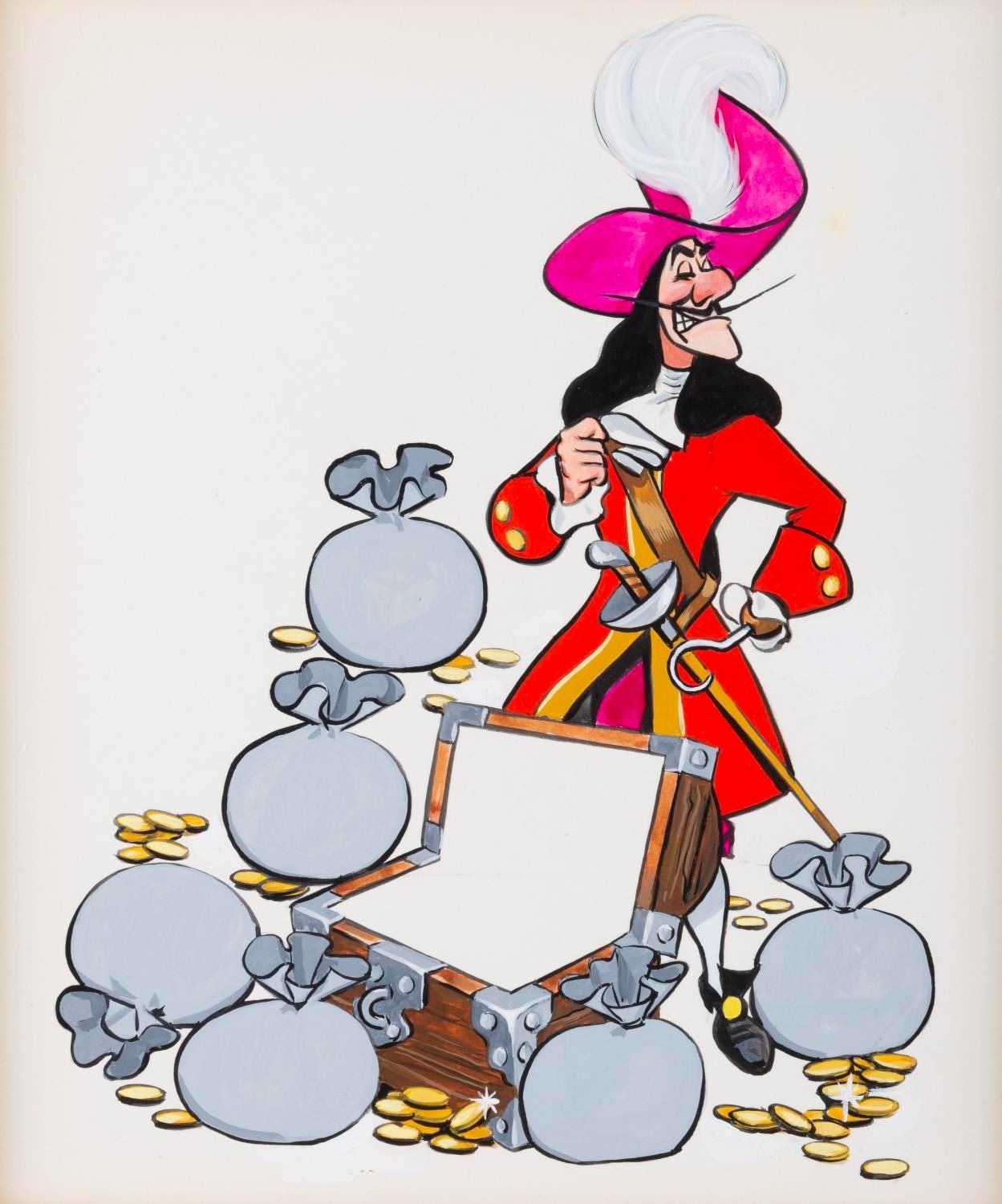 (Disneyland, 1960s-70s) An original painting of Captain Hook from "Peter Pan " surrounded by treasure. This merchandising art comes from the estate of Dawn Esposito, who worked as a Disney Art Director. Hook has an image size of 8.5 " x 9.5 " in a 13.5 " x 15.5 " visible window. The art is in very good condition with light smudges, spots of discoloration, and wear.