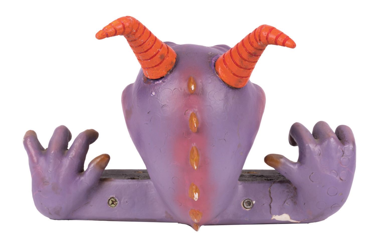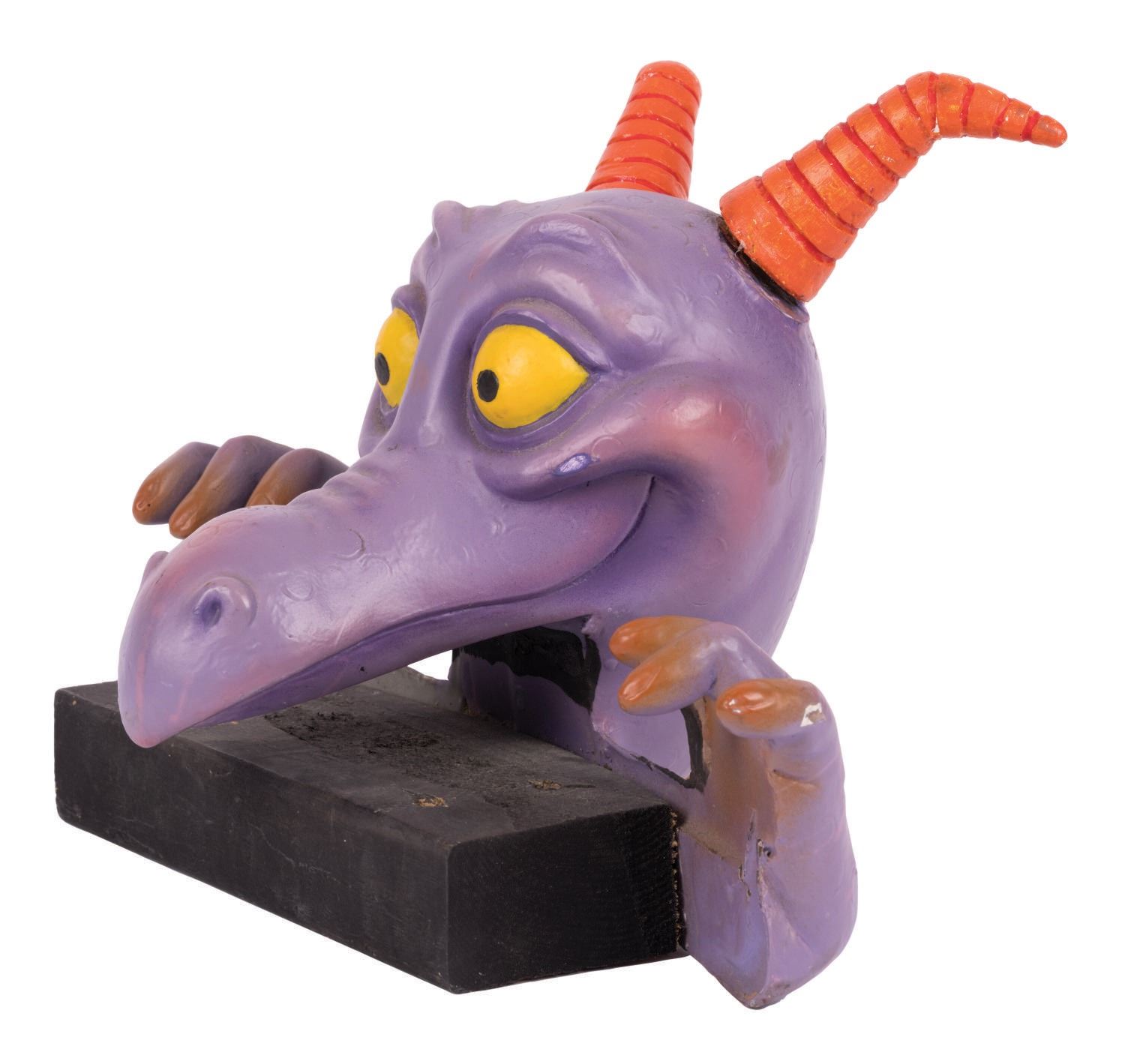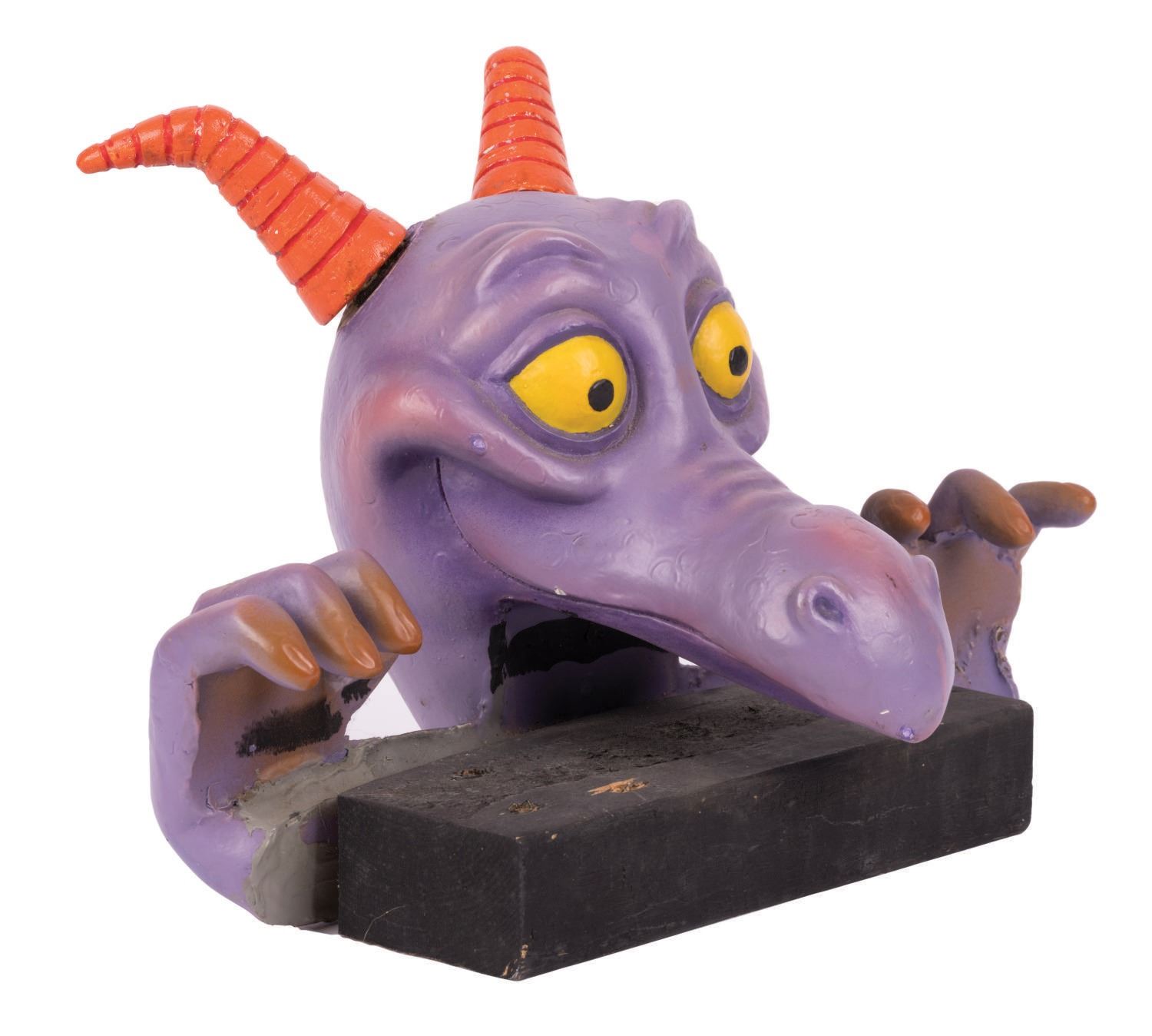 (EPCOT Center, 1983-1998) An original park-used Figment Figure from Journey Into Imagination at EPCOT Center. This static figure was one of (26) total animated figures in the original show, and would peek from behind an obstruction until its removal during a repair or scheduled rehabilitation. Measuring 8.5"x13" and 11.5" deep, the hand painted composition figure is in good condition with scuffs, scratches, and wear from Park display, handling, and age.