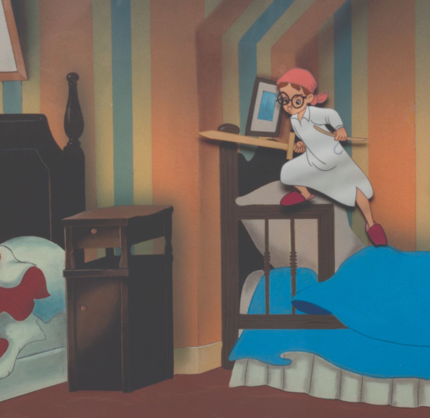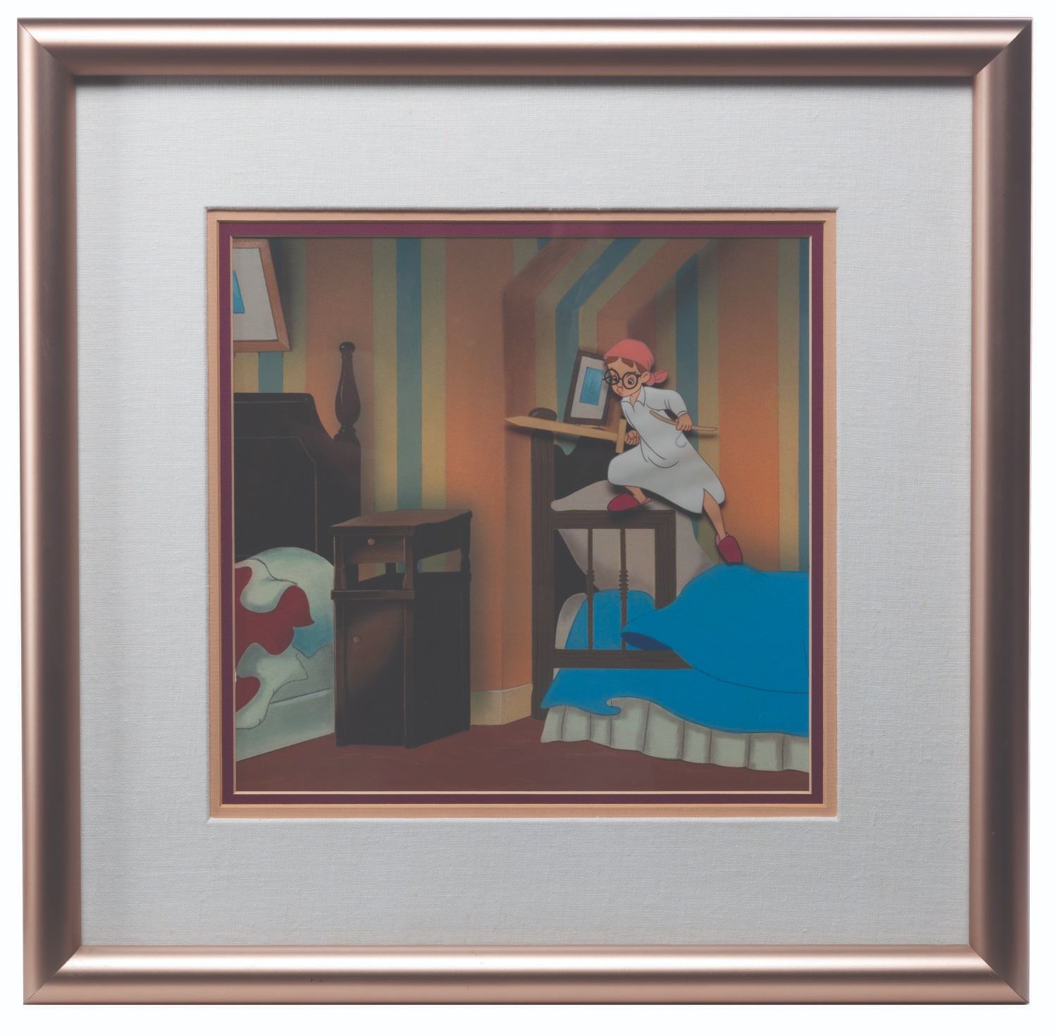 (Disney, 1953) An original production cel of Michael from the opening scene of “Peter Pan.” The cel is paired with a custom hand-painted background. The character image size is 4.25” x 4.25” on a 10.25” x 10.75” visible opening within a 17” x 16.75” matte. The piece displays in fine condition.