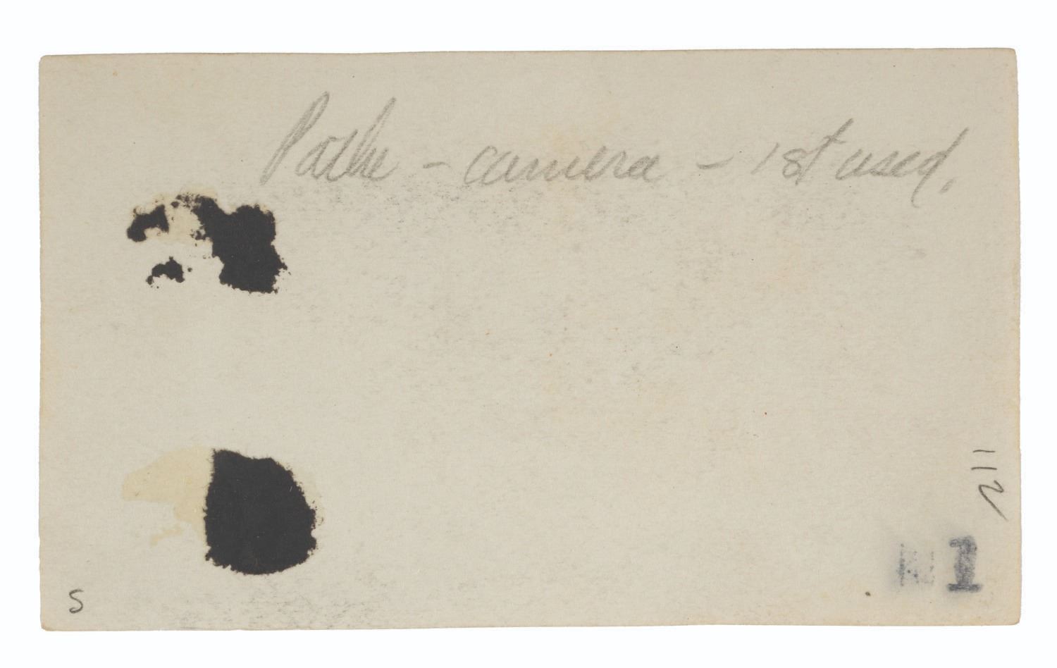 (Disney, 1923) An extremely rare original 1923 photo of Walt Disney. The 2.5” x 4” photo came from the estate of Carl Stalling and features Disney in the yard of his Uncle’s House at 4406 Kingswell Ave in Los Angeles with his Pathe’ Motion Picture Camera. Walt himself inscribed in pencil on the reverse–“Pathe-Camera-1st Used.” The photo is in good condition with some paper residue on the back from a previous mounting in a scrapbook.