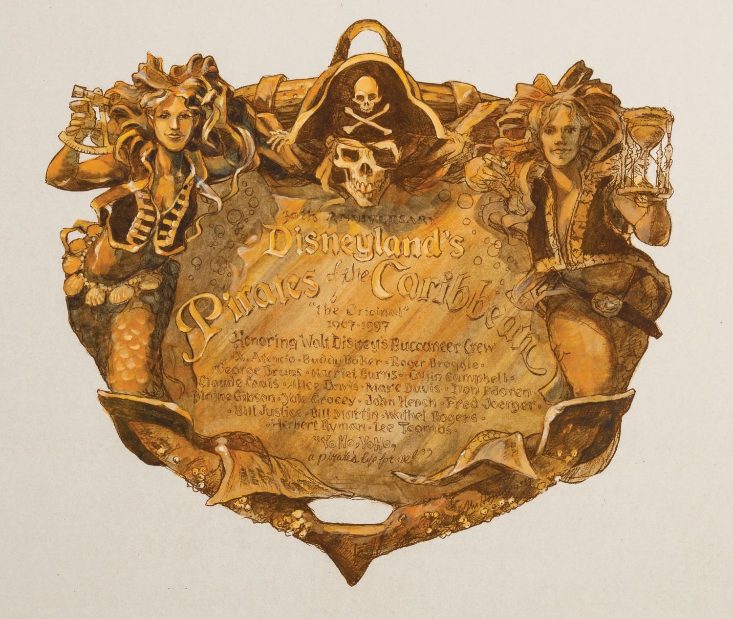 (Disneyland, 1997) An impressive conceptual painting of the plaque created for the 30th anniversary of the Pirates of the Caribbean at Disneyland by Imagineer John Horny. The artwork is accomplished on 18.25"x20.5" artists paper in gouache and marker over xeroxed lines and mounted to 32"x40" artist's board. the piece is in fine condition.