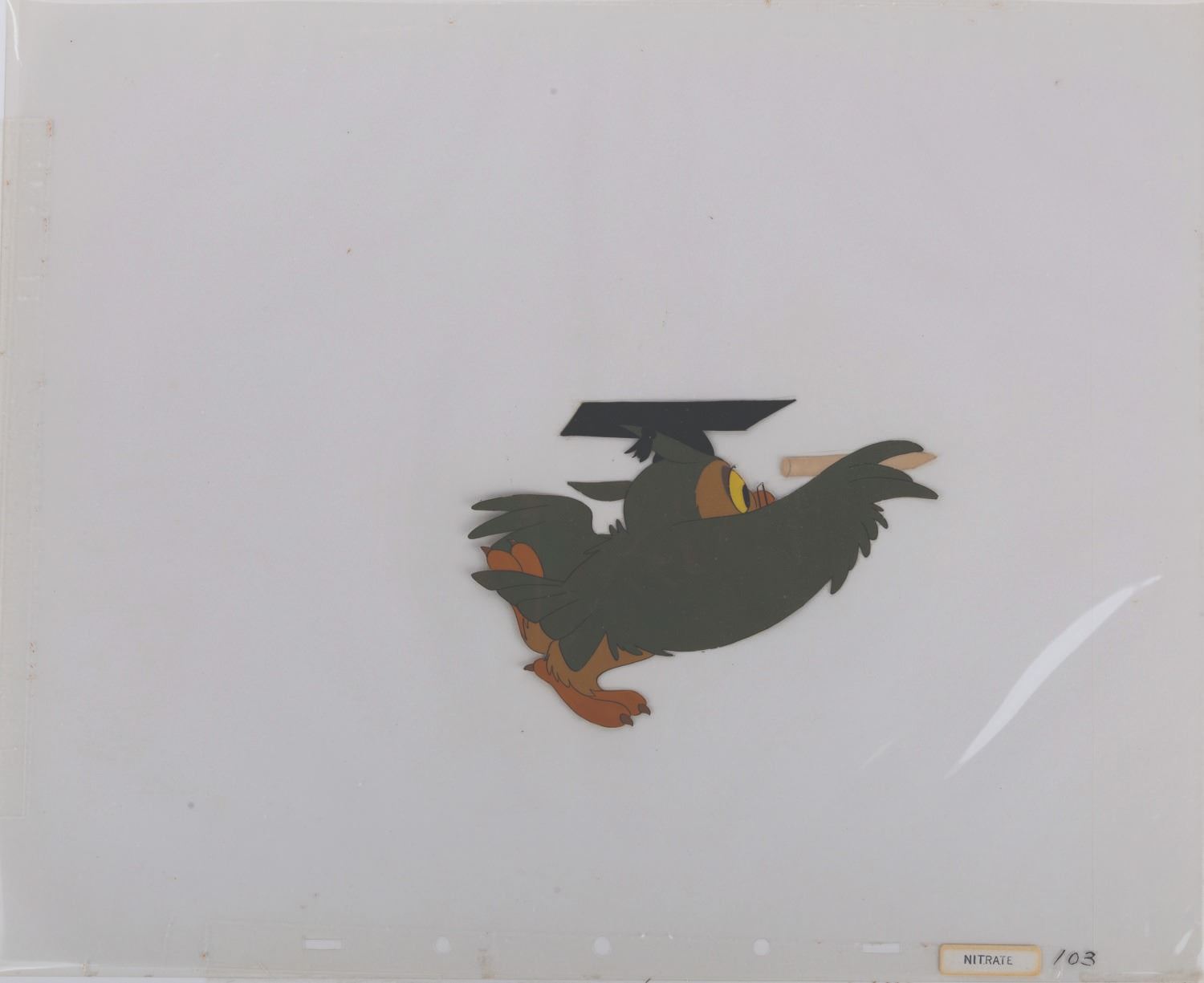 (Disney, 1949) An original production cel of the Wise Old Owl from Walt Disney's"So Dear to My Heart." This character has an image size of 6"x4.5" on an untrimmed 12"x15.5: animation cel. The cel is in very good condition, with a tiny spot of paint loss on one ear and wear to the ink lines.