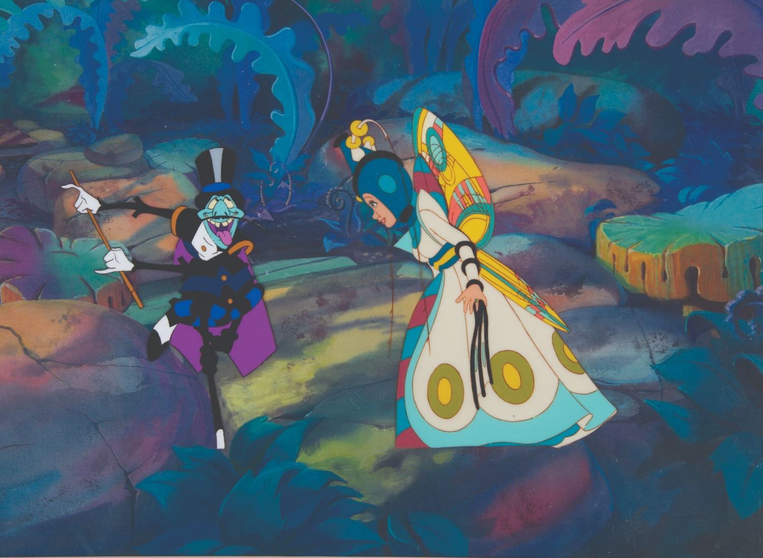 (Warner Bros./Don Bluth, 1994) An original production cel set up from the 1994 Feature Film,"Thumbelina." These hand-painted cels depict Thumbelina and Mr. Beetle, with a color copy background. The cels measure 13.5"x16.5" with character image sizes of 4.25"x5.75" and 5.25"x6.75". The cels are in very good condition with minor wear from production.