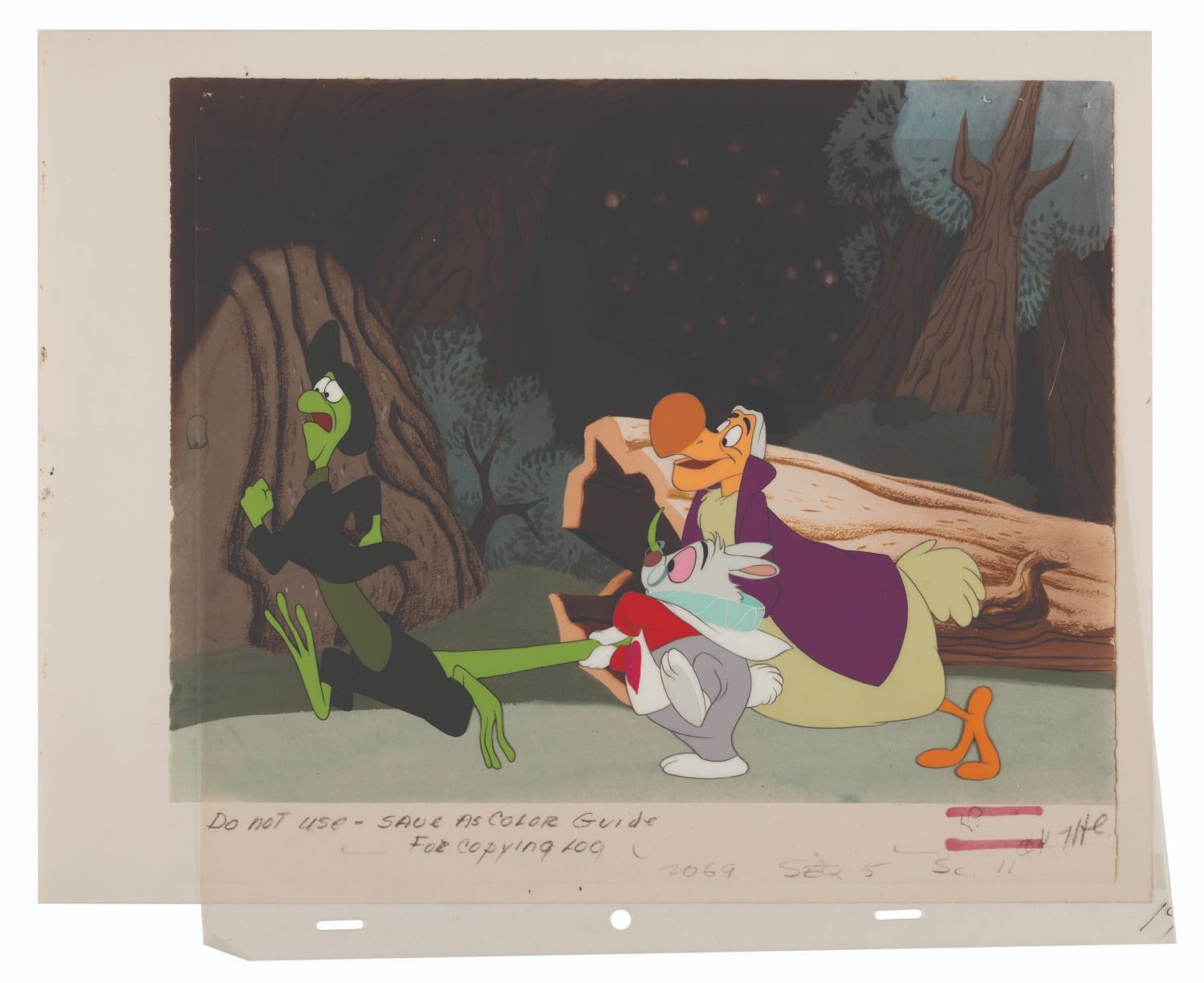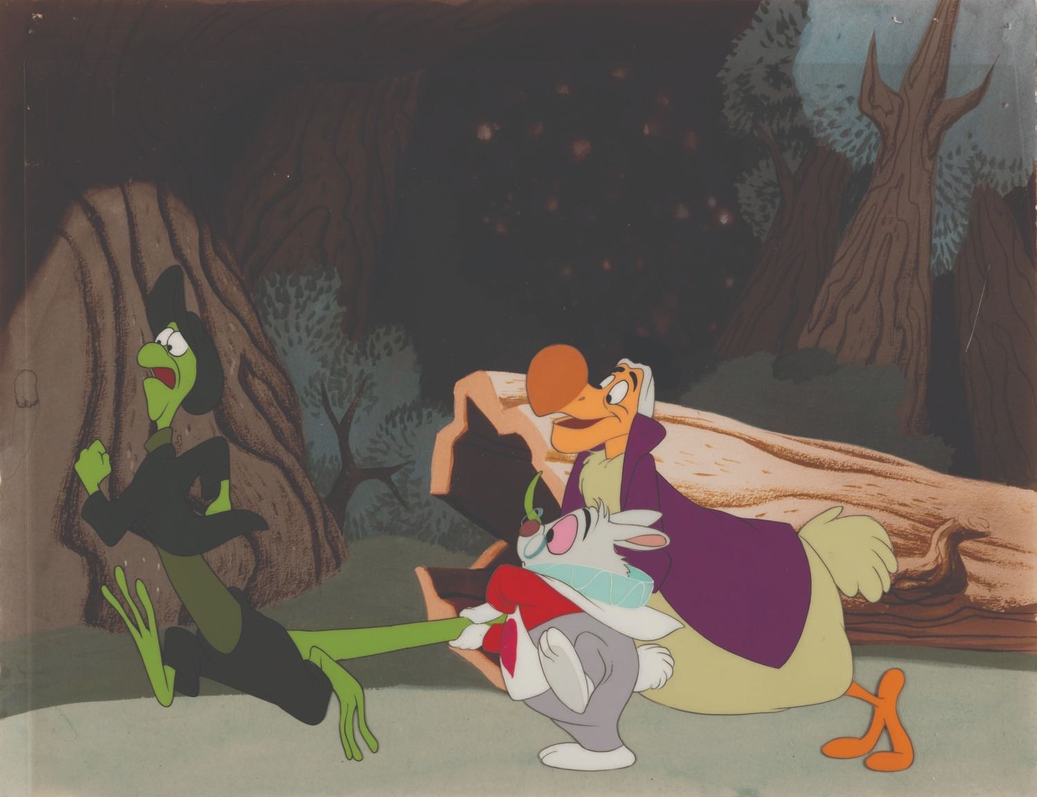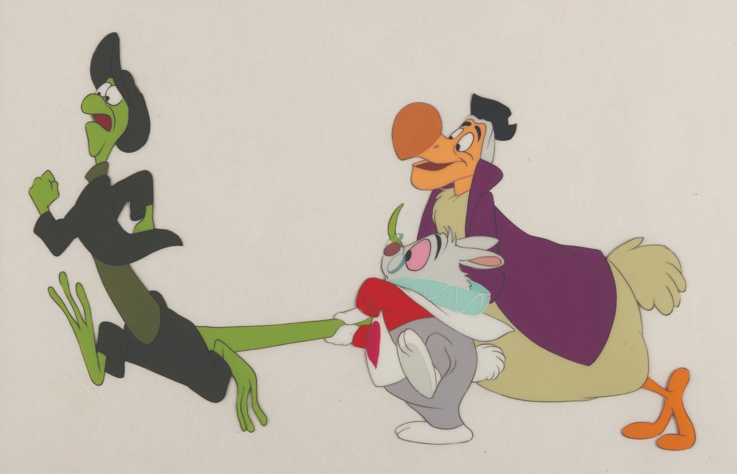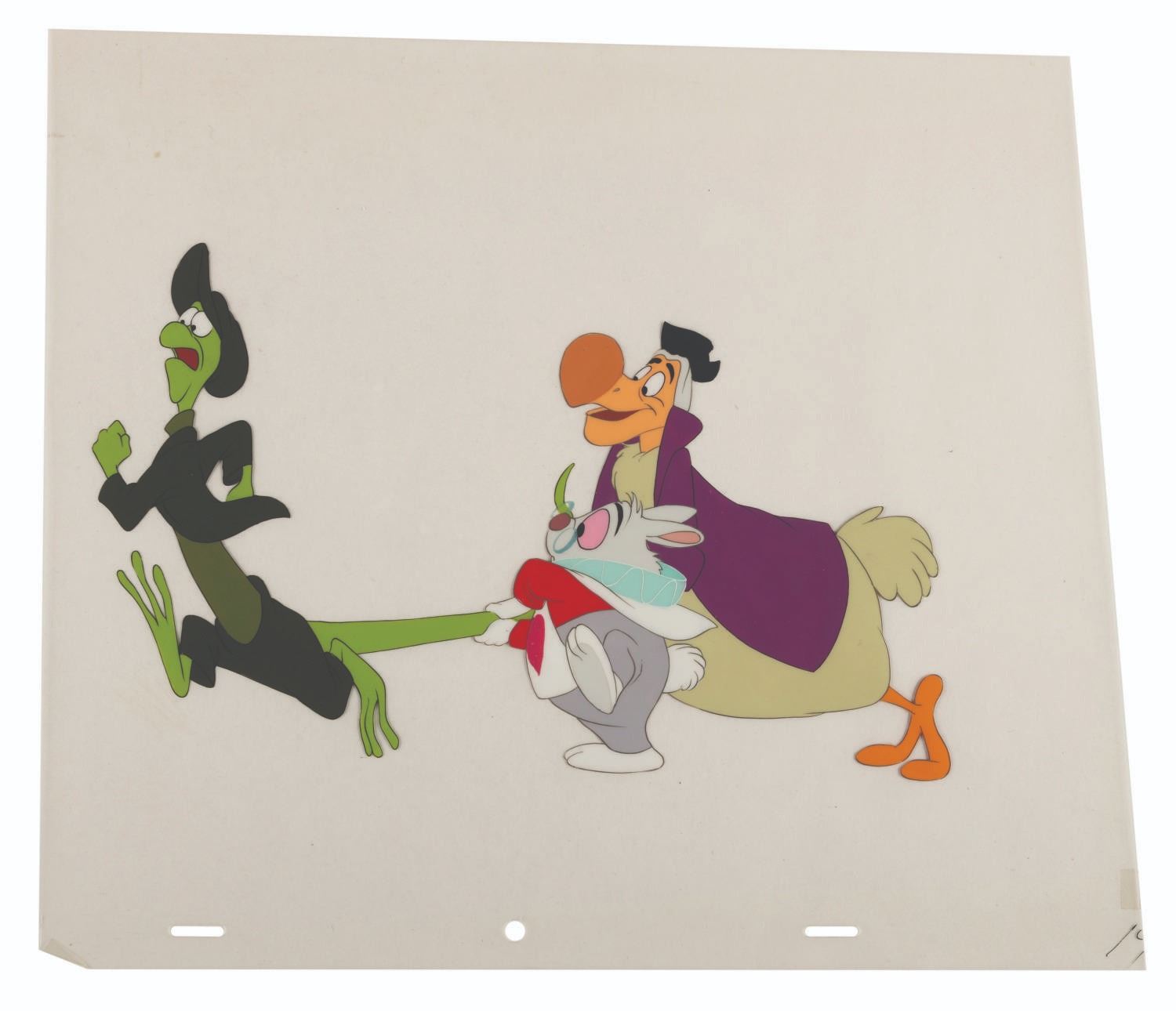 (Disney. 1951) An original production cel featuring the White Rabbit, Lizard, and Dodo Bird from Walt Disney's 1951 feature film, "Alice In Wonderland." The total image size of the characters is 9"x6" on a slightly trimmed 11.5"x10" animation cel. The artwork is in very good condition with all paint intact. The cel has been placed on a color copy background.