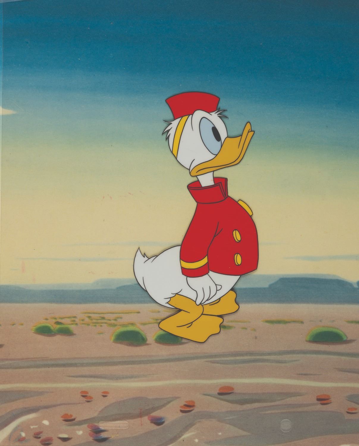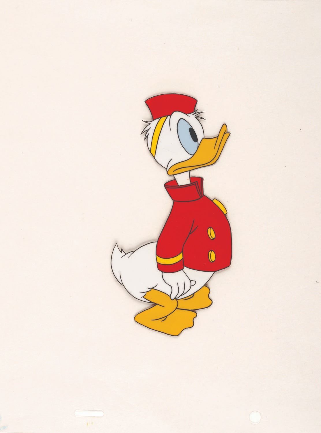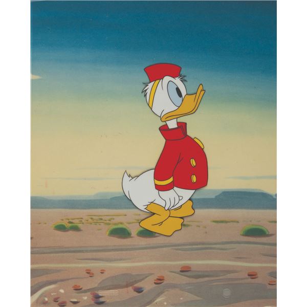 (Disney, 1942) An original production cel of Donald Duck from Walt Disney’s animated short "Bellboy Donald." Donald has an image size of 5.25" x 2.5" on a slightly trimmed 9.25"x7.5" cel. The cel has been placed on a color copy background and is in fine condition.