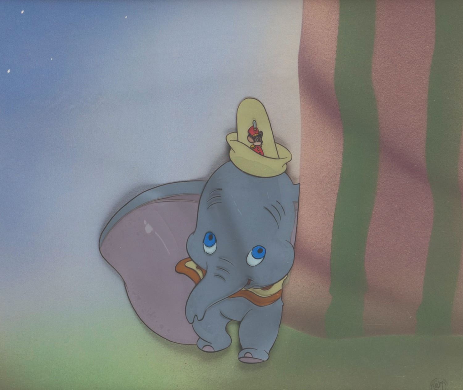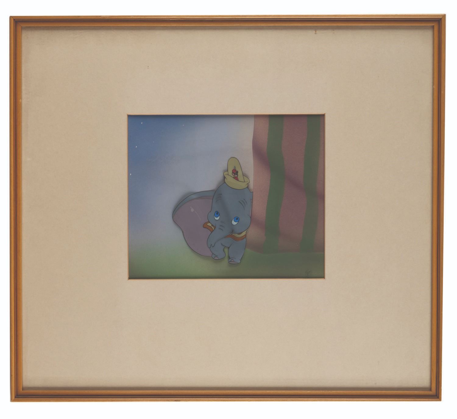 (Disney, 1941) A beautiful original production cel featuring Dumbo and Timothy from Disney's "Dumbo." The cel has been trimmed and placed on a custom airbrushed background as prepared by Courvoisier Galleries for sale. The image size of the characters is 2.75"x3.5". The entire piece measures 7"x6". The artwork is in very good condition with some chipping and lifting along the right edge of Dumbo and in his ear.