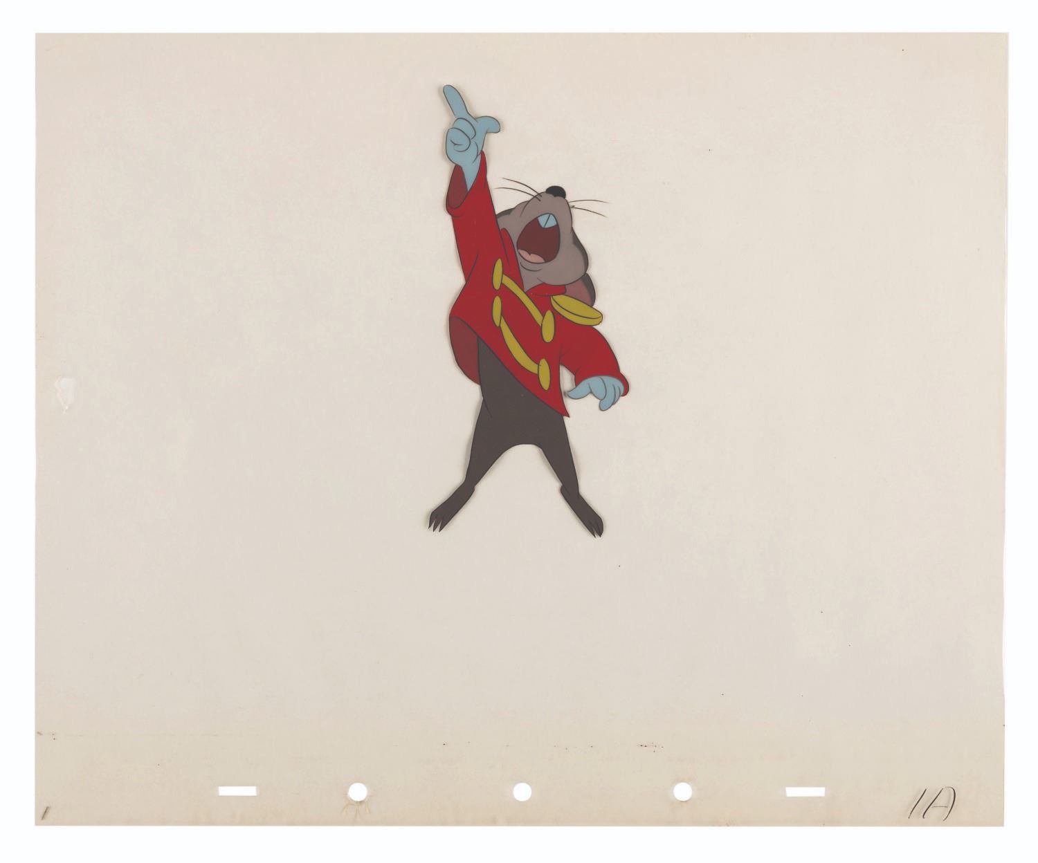 (Disney, 1941) An original production cel of Timothy Mouse from Disney's 1941 film, "Dumbo." Timothy measures 6.5"x 5" on an untrimmed 11.75"x9.5" cel. The cel is in very good condition with all paint intact.
