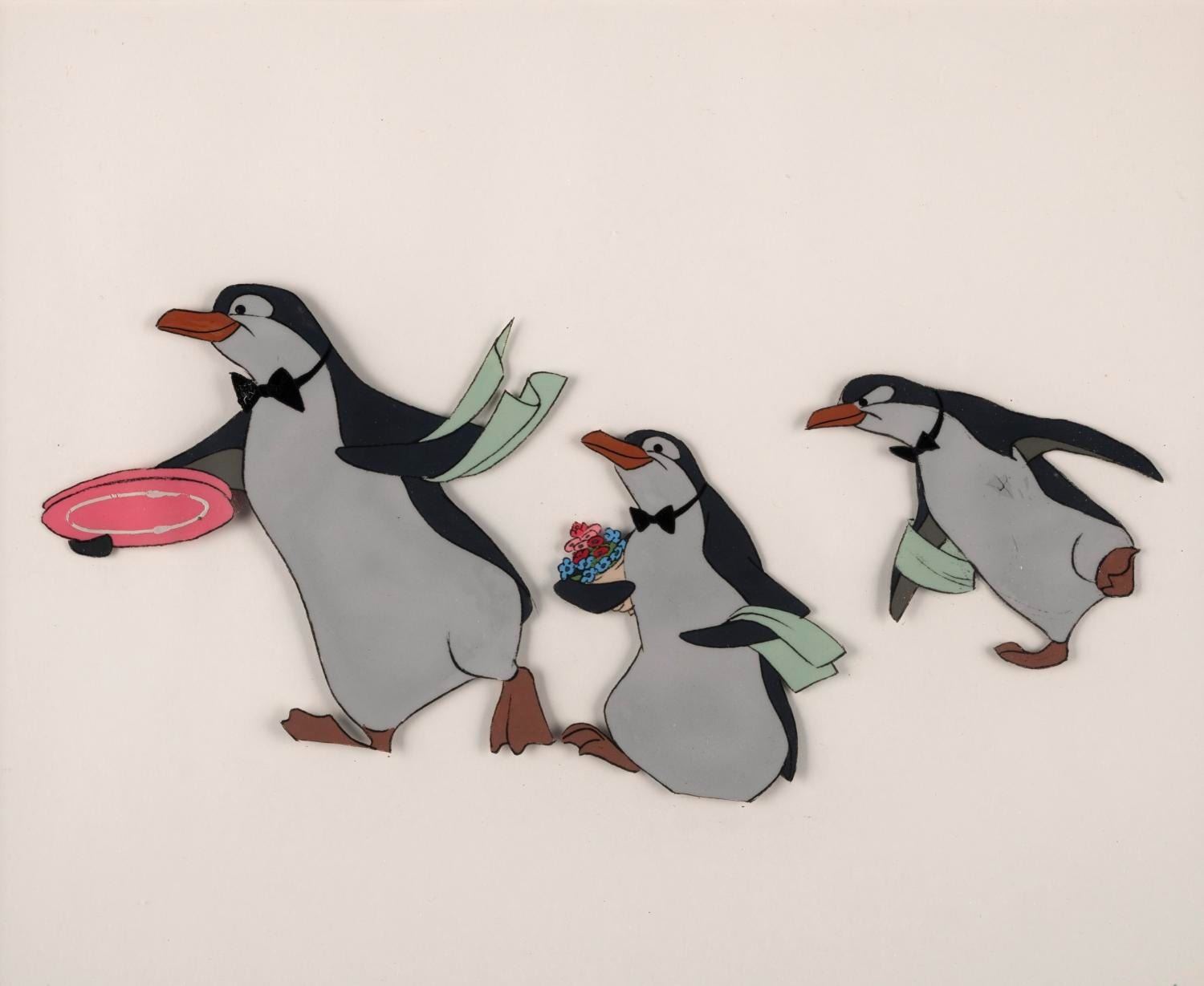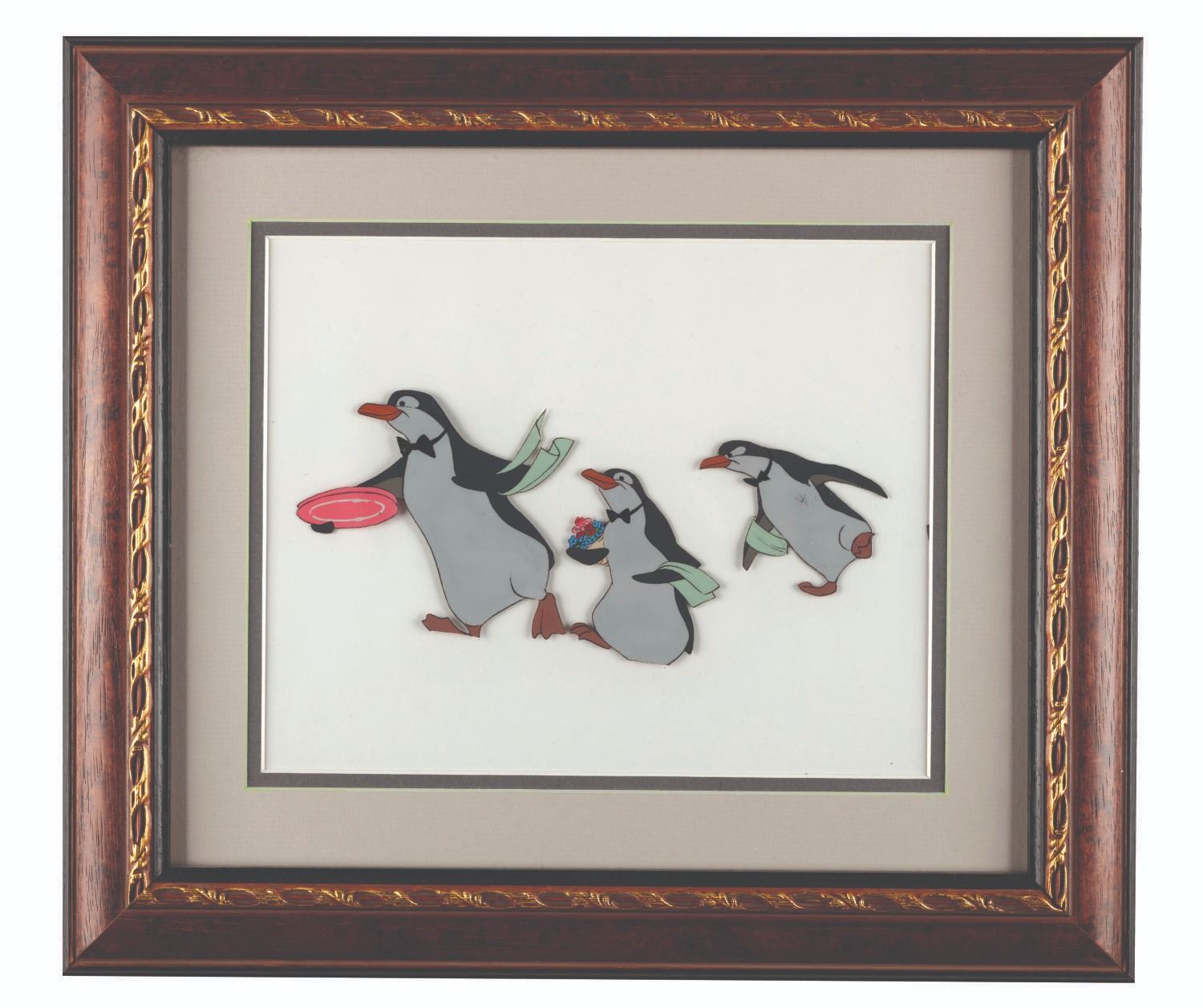 (Disney, 1964) A charming original production cel featuring the penguin waiters from the "Jolly Holiday" sequence of Walt Disney's "Mary Poppins." The cel was originally sold at the Art Corner in Disneyland and has since been removed from the original mat and reframed. The total image size of the characters is 4"x8.5" on a trimmed 10"x8" cel. The artwork is in very good condition with a small crack in the body of the penguin on the right. The original Art Corner Label has been retained on the reverse.